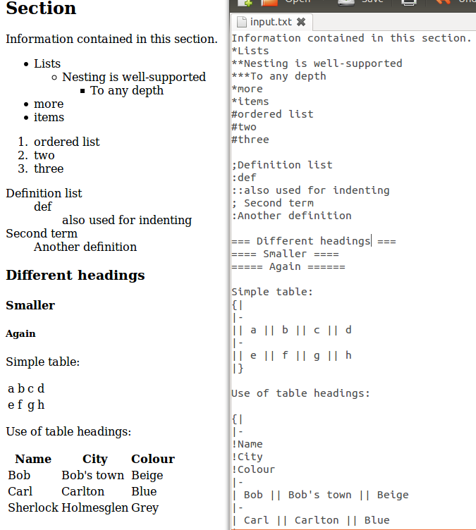 I’ve just uploaded the first development version (0.4.2) of my in-house wikitext parser. This example shows off what it can do: