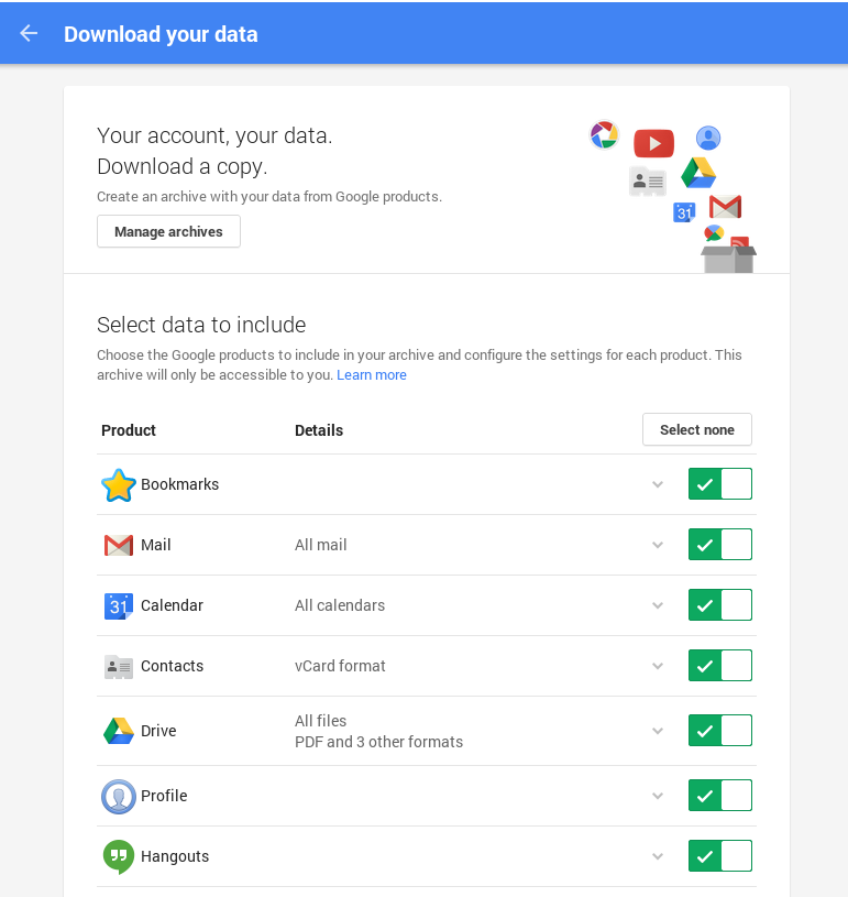 If you use Gmail or hosted Google Apps, you might be interested in taking a backup of your data, such as emails, Drive documents, and calendar entries. Thankfully, you can usually export copy of your account data using Google Takeout.