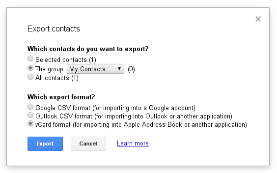 Select the vCard format here, as it’s the same format which Takeout would have used: