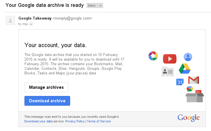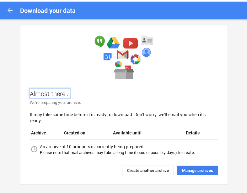 It can be a bit eye-opening to see the amount of data Google has on you (Files, conversations, location history, etc). At this point, click through to “Prepare Download”. Depending on the size of your account, this may take the duration of a coffee break, a few hours, or even an entire day.