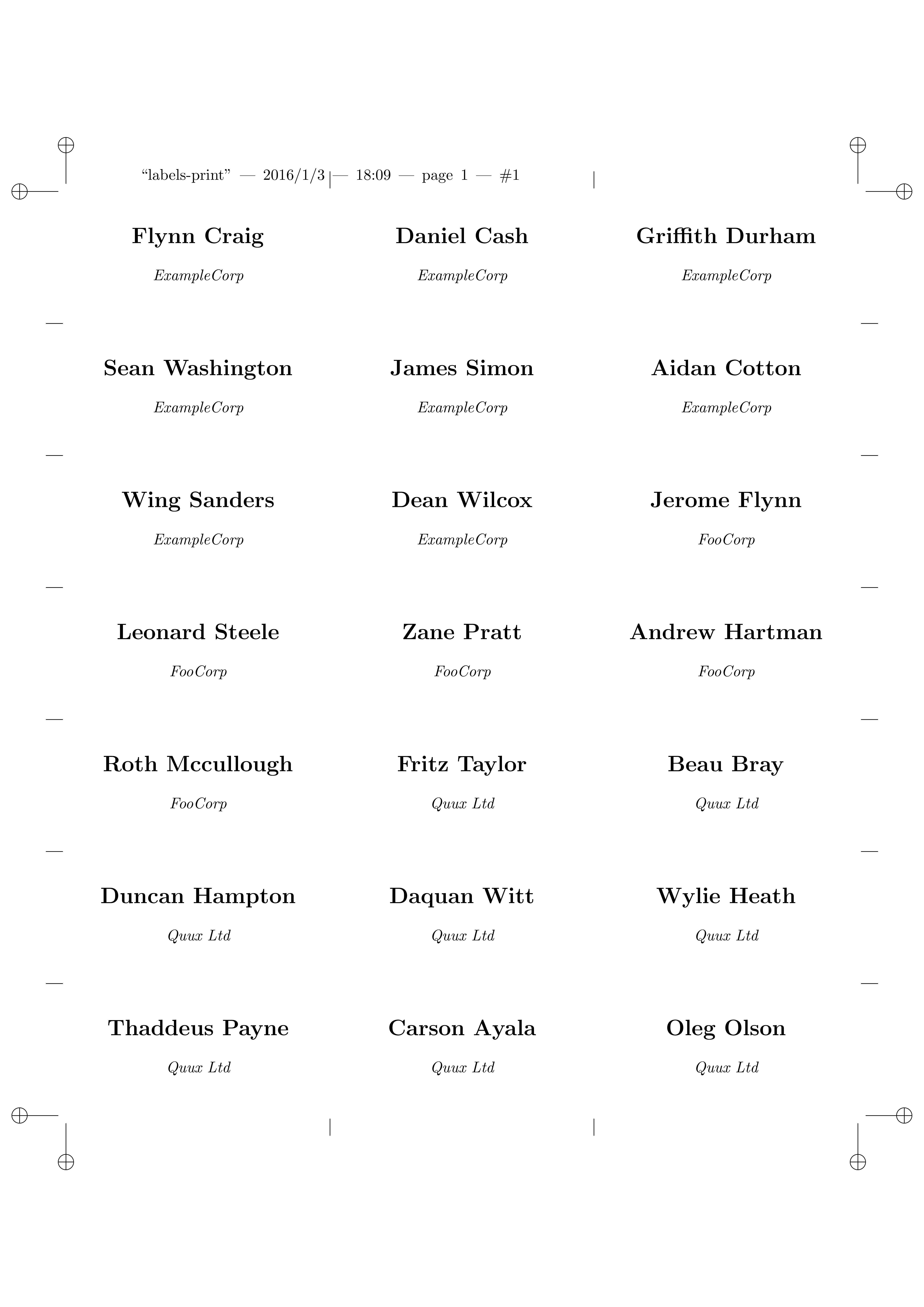 Here is an example PDF which creates tiny name tags. All names here are randomly generated.