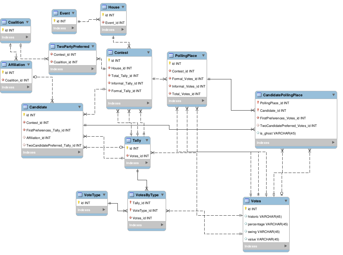 You will be able to locate many electoral concepts in this data model, as candidates with a particular affiliation receive votes (contest eachother) at different polling places for a seat in one of the houses. This maps to the more extensive XML format to extract the fields that I was most interested in mapping.