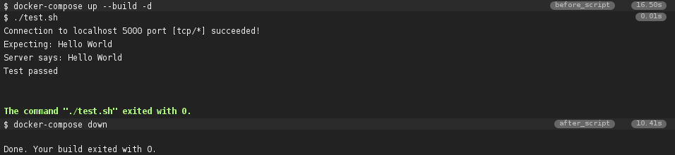 I’ll assume that if you’re reading this, you are familiar with the basics of Travis CI. The large block of code below is the .travis.yml file to set up the test machine, then execute the tests against a container.