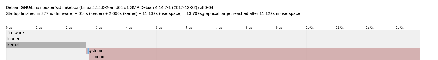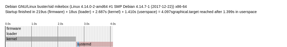 This blog post is a throwback to “Booting Debian in 14 seconds” from debian-administration.org, where the author went through some fairly advanced steps to get his low-spec Debian laptop to boot quickly. Debian was version 4.0 at the time, and I recall it taking around 40 seconds to boot on a default desktop install.