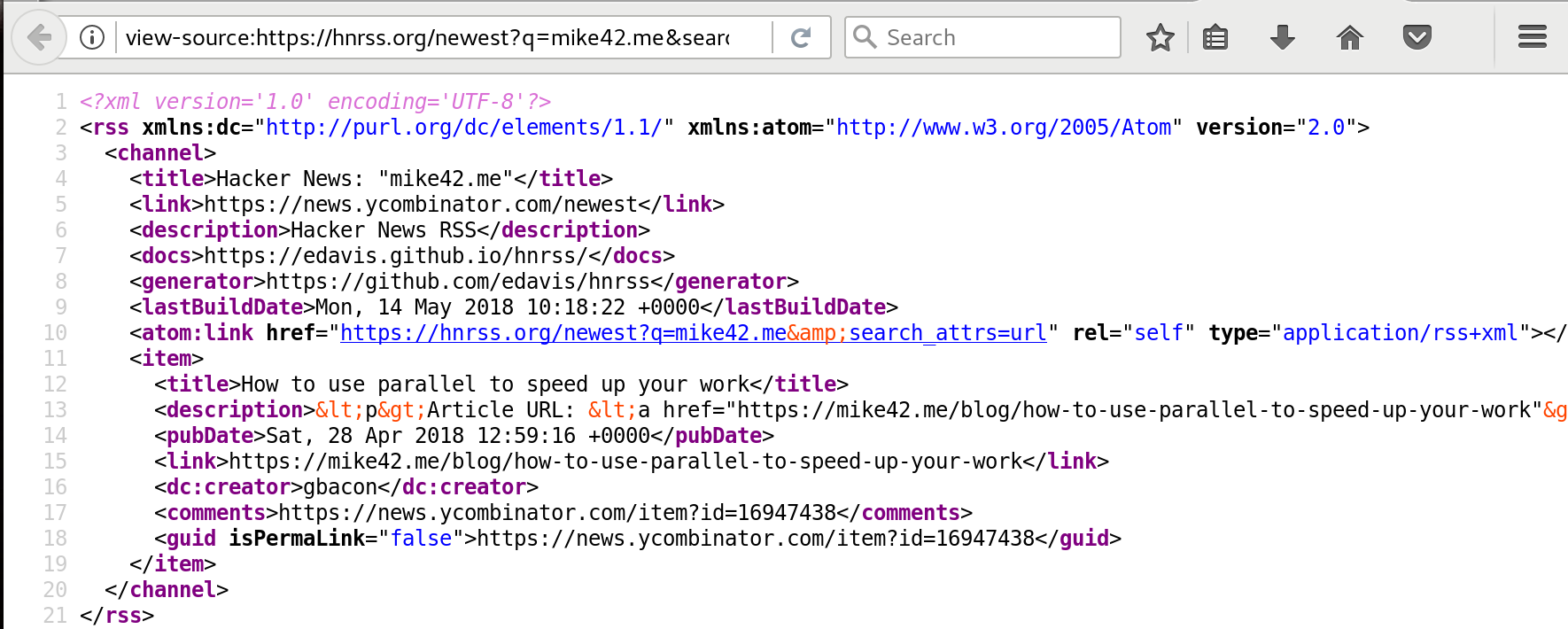 Hacker news does not publish its own RSS feeds, so I had to use a third-party service. I found a URL that would feed me the feed to the latest articles off this site, by searching the “url” attribute:
