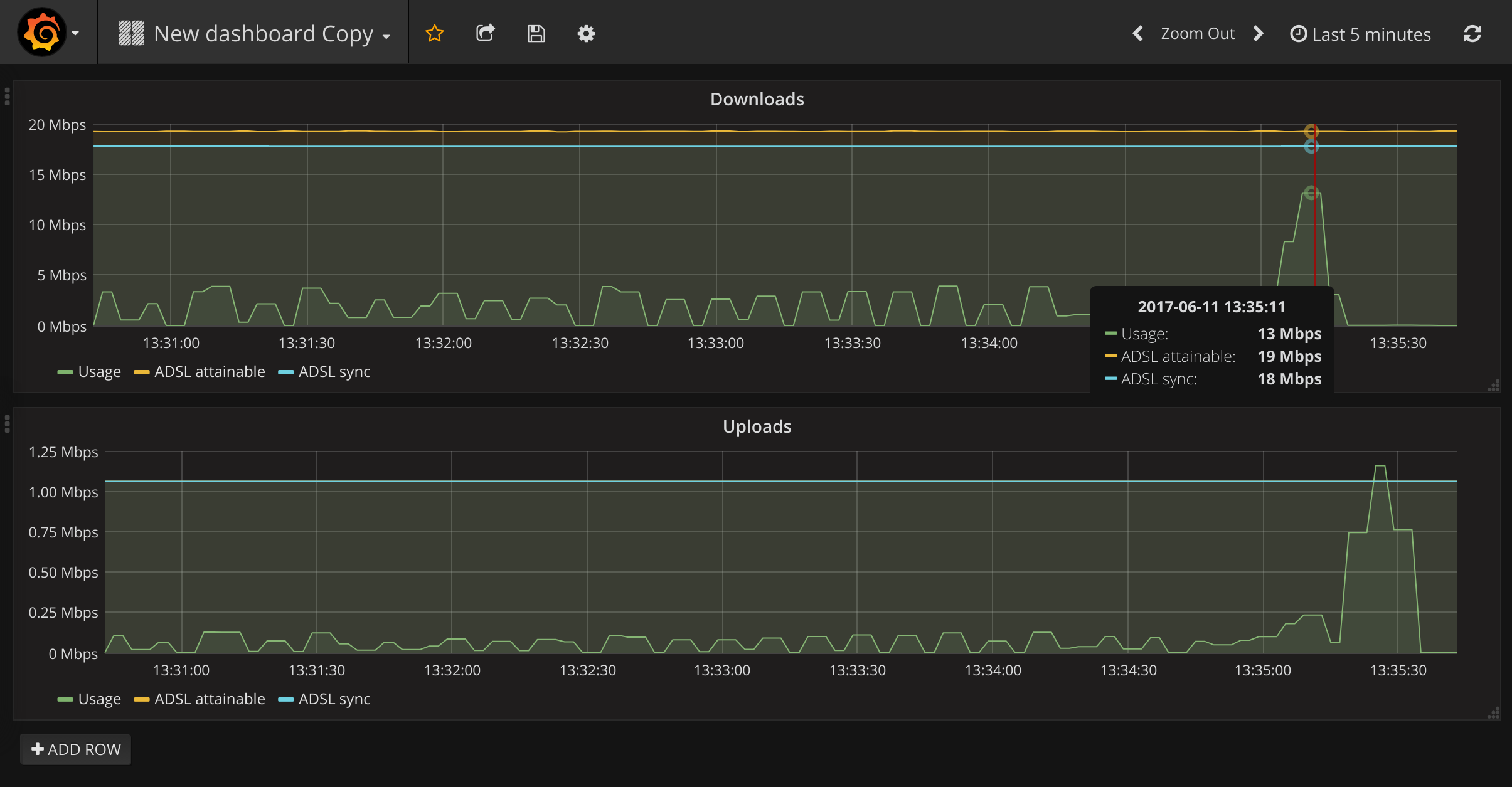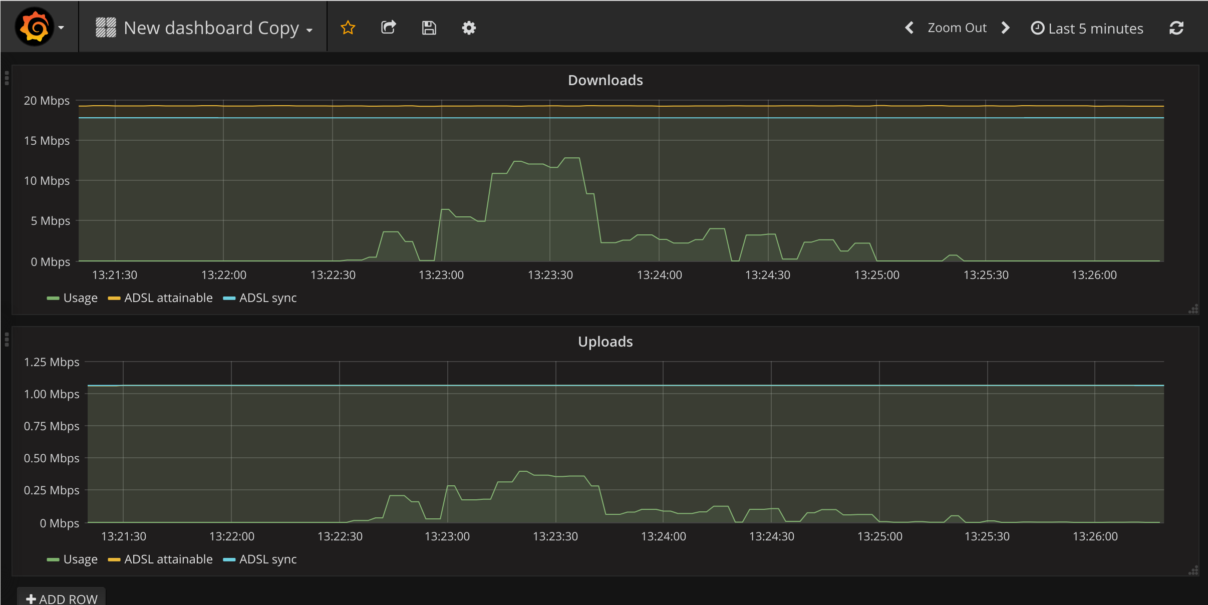 I can derive throughput metrics for the uplink if I scrape these metrics every few seconds and load them into a time-series database. To do this, I wrote a small adapter (called an “exporter” in Prometheus lingo), which exposed the metrics in a more structured way.