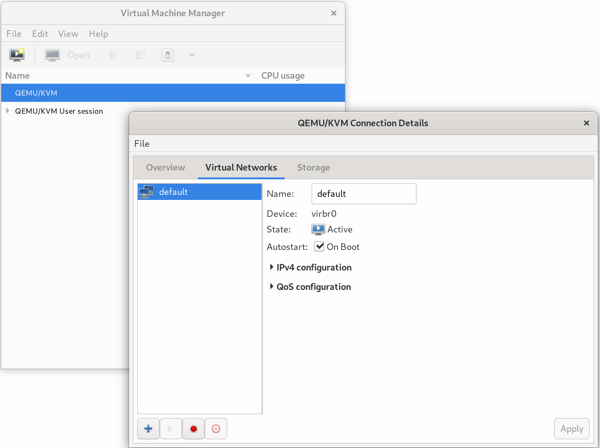 Under Virtual Networks → default → Autostart, check On Boot, then click Apply.