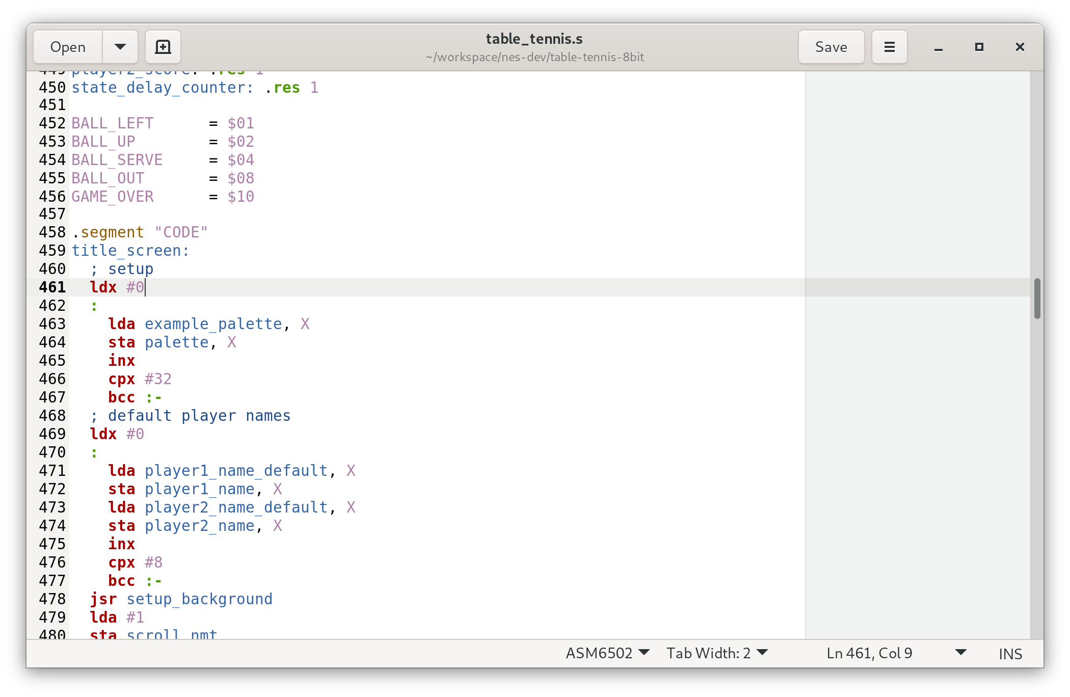 Out of the box, Gedit can’t syntax highlight 6502 assembly. I found a language spec file for it on the 6502.org forums, and edited it slightly before using it.