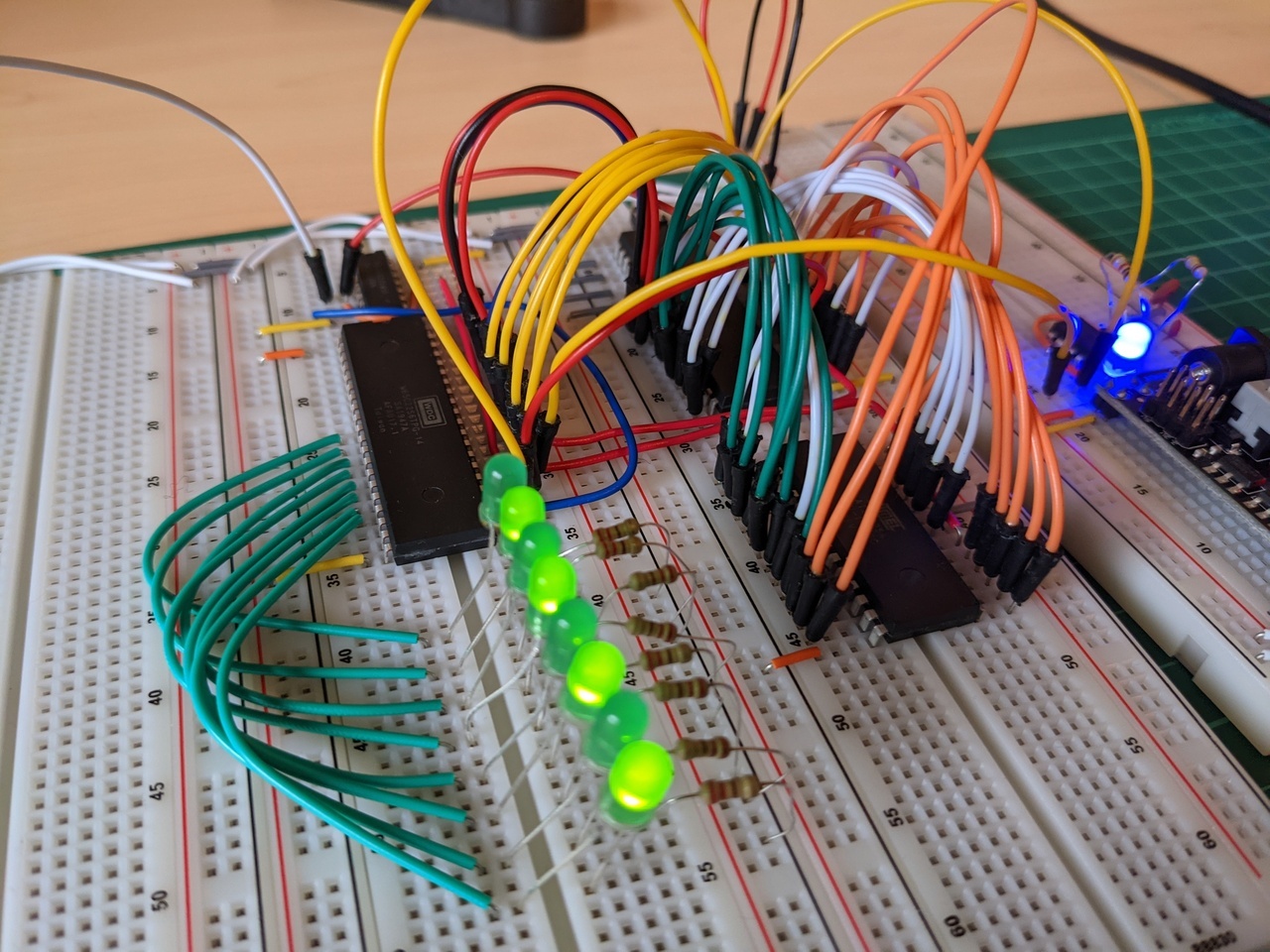 Next, I tried to extend the circuit to blink some LED’s based on a programmed sequence. When I ran the program, the 65c22 I/O chip warmed up, and my row of LED lights did not blink. It turns out that I had mixed up the meaning of VCC and VSS, and applied a reverse voltage to the chip. I found a post from somebody else who had made the same mistake, and corrected it before the chip was damaged.