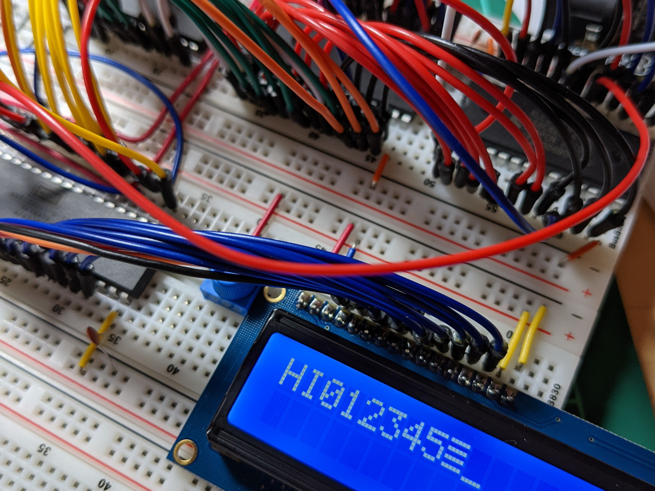 The next step was to add an LCD and some RAM. My first attempt did not work, and it took me a few hours of troubleshooting to rule out any hardware problems. In the end it was a simple programming error, where I had used a jmp instruction instead of jsr in my test program.
