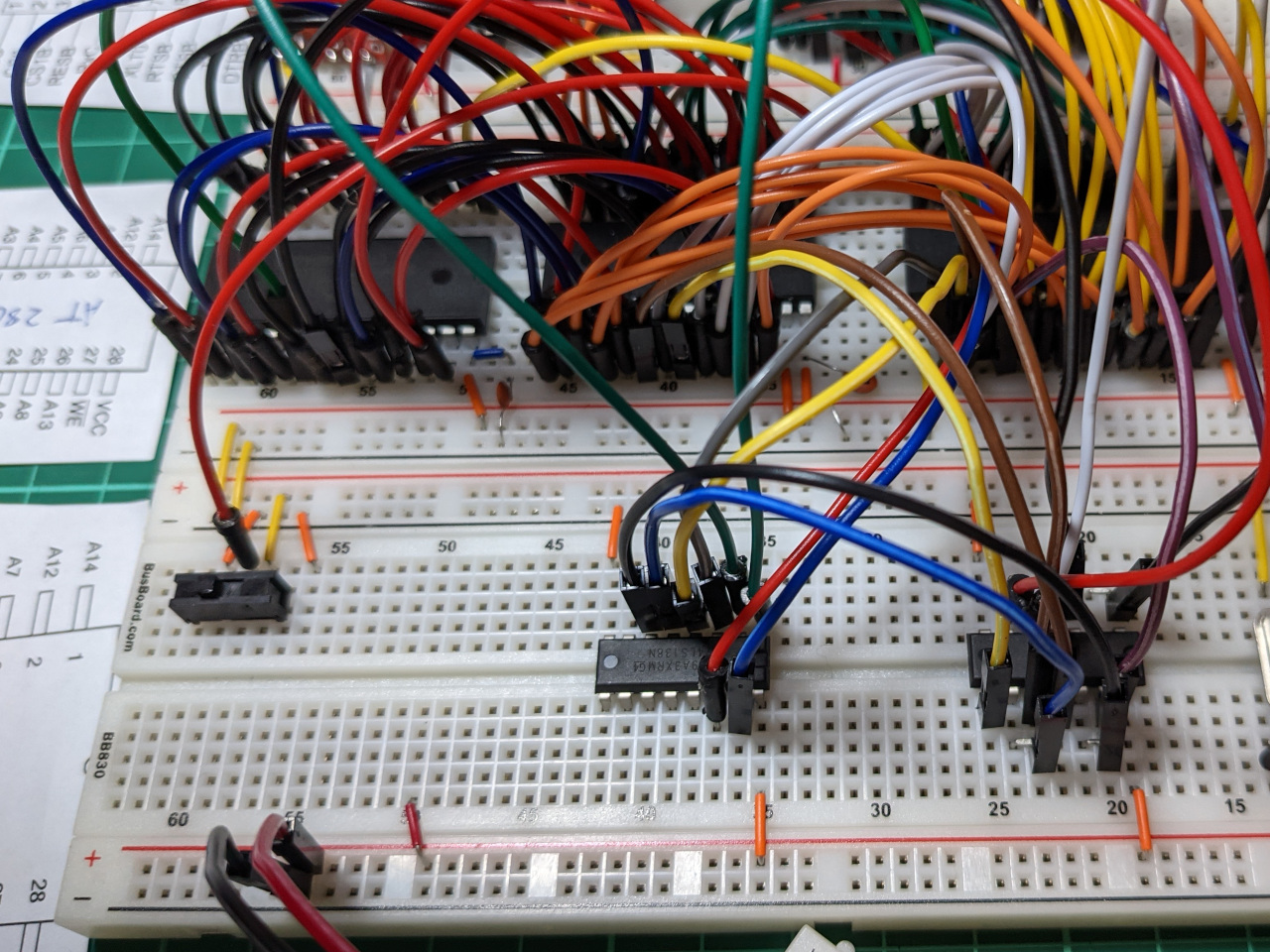 After the last step, the computer started producing the wrong text (eg. “H” became “D”). I had mixed up two bits in the data bus, and by some luck the UART setup code was not affected. The orange and red wires on the left of this photo are the ones which were swapped.