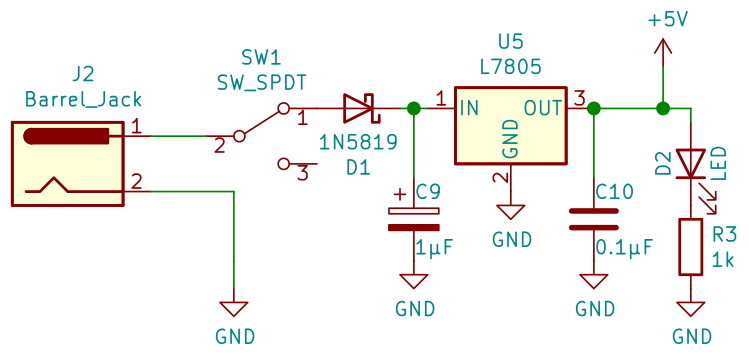 This takes a DC voltage, and steps it down to 5v through a voltage regulator. The other components are a power switch, plus a diode so that I can avoid damaging anything if I connect a plug with the wrong polarity.