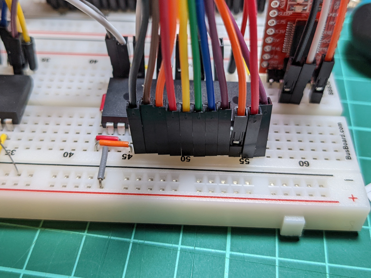 I did this in four steps, testing after each one. First I moved the LCD off to its own breadboard, then updated the computer’s test program to stop using the LCD, ran the computer without the LCD connected, and finally re-located the UART chip into the newly-vacant space.