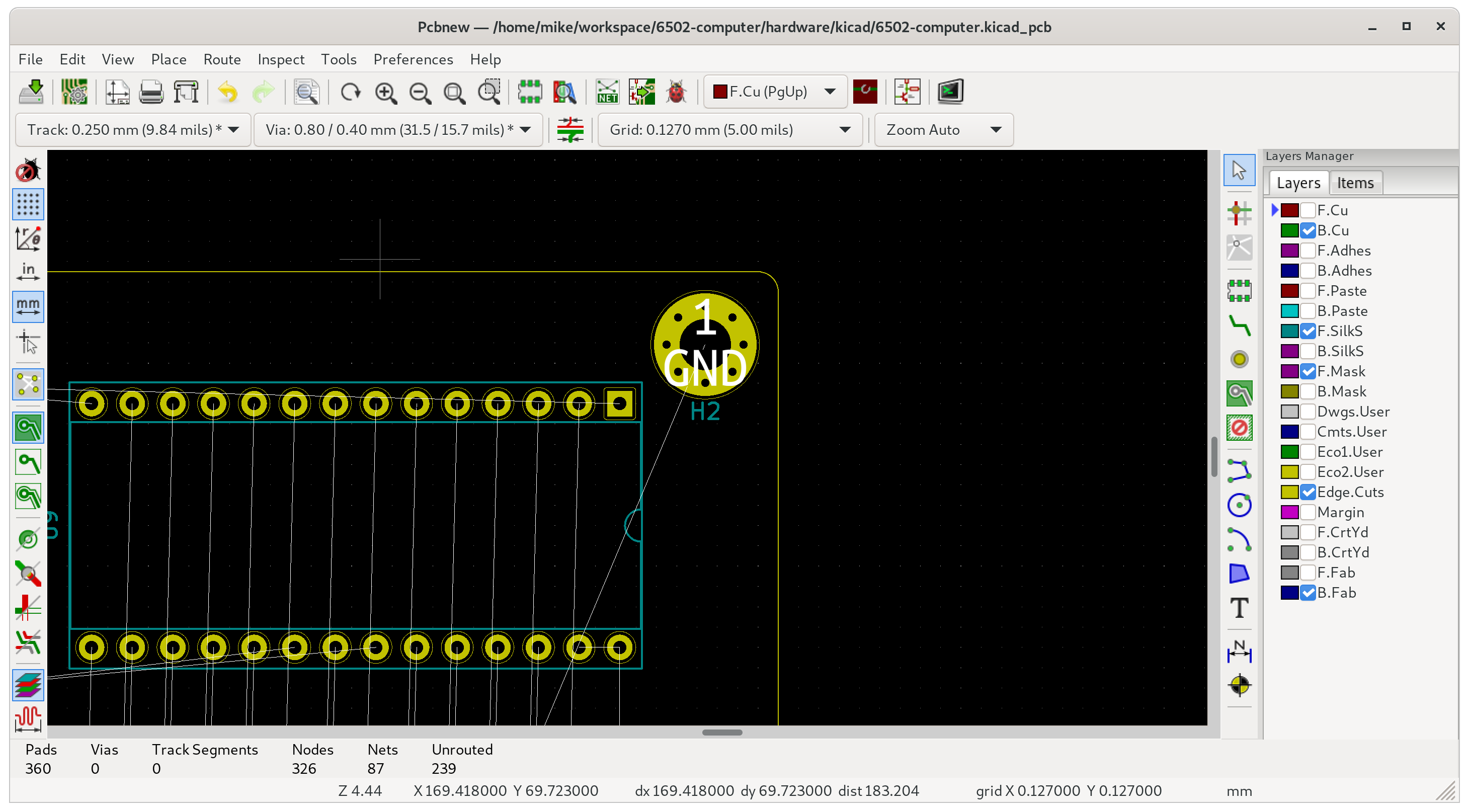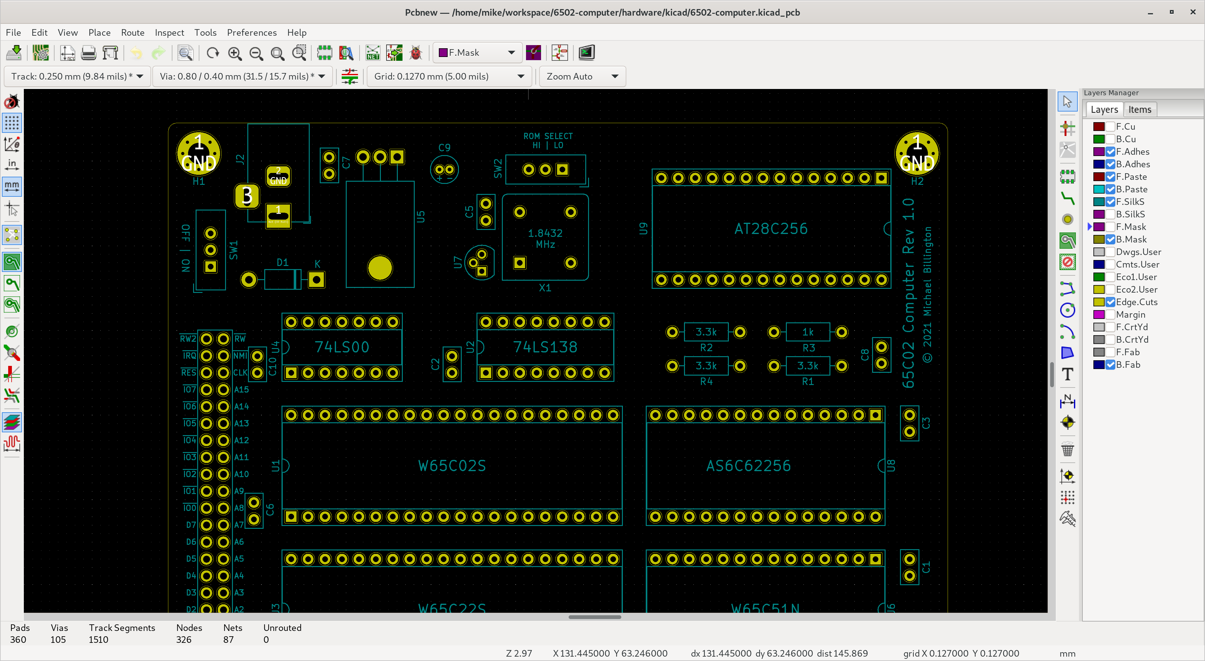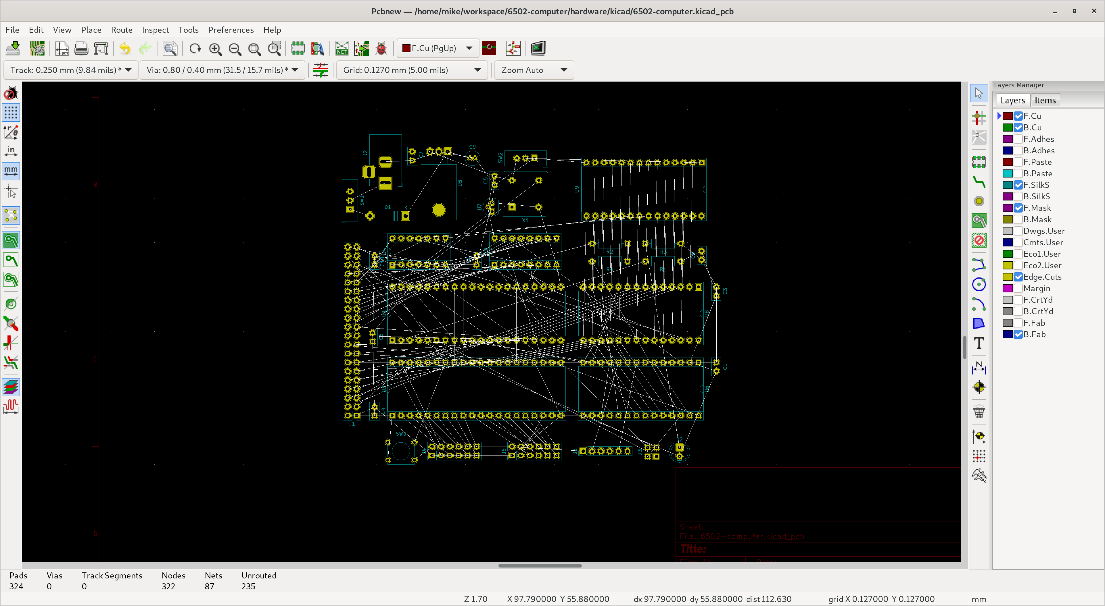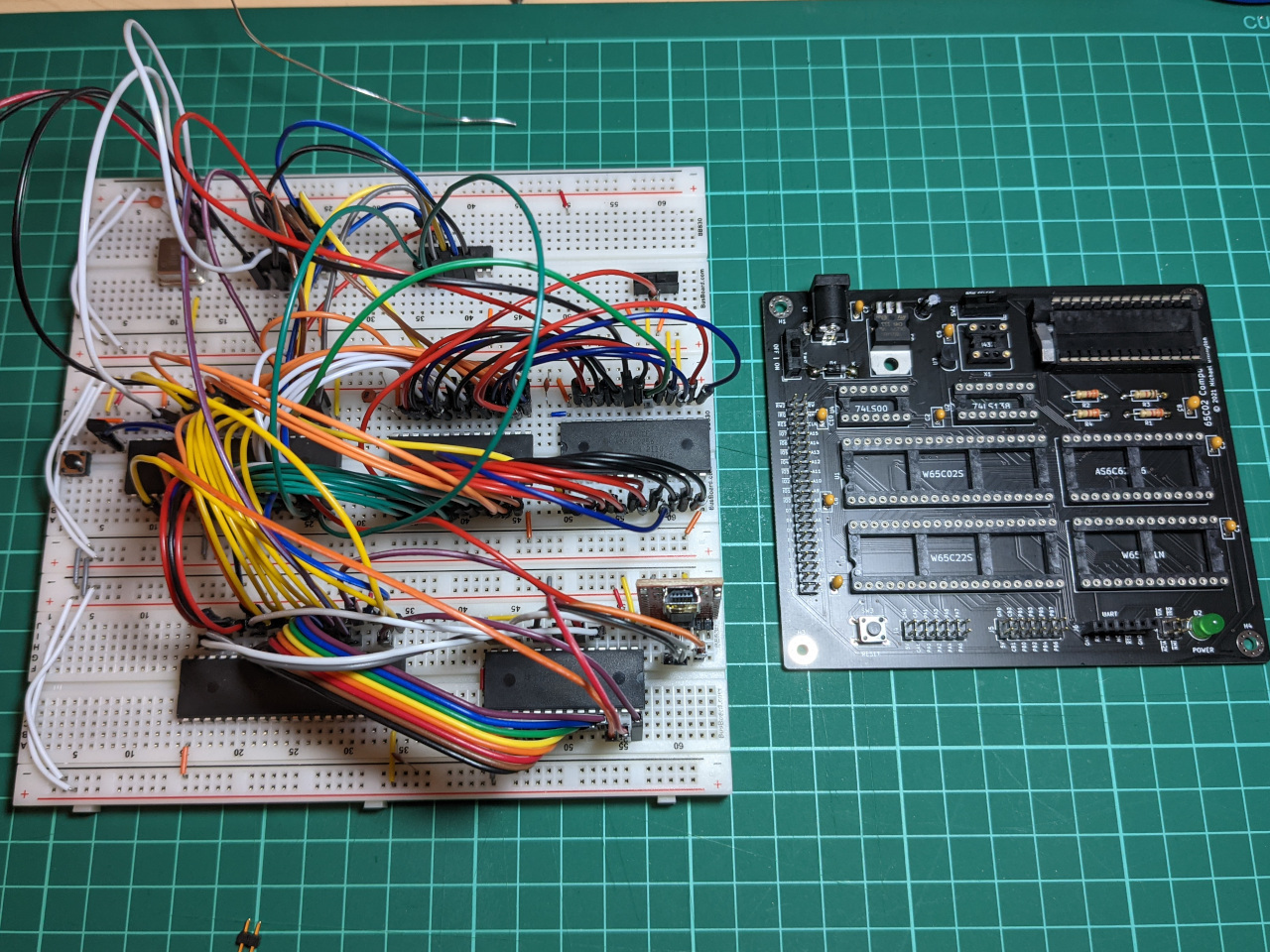 I’ve recently been working on building a 6502-based computer on breadboards as a learning project. After making a few revisions, and porting some software to run on it, I was confident that my computer worked well enough to connect up permanently on a circuit board.
