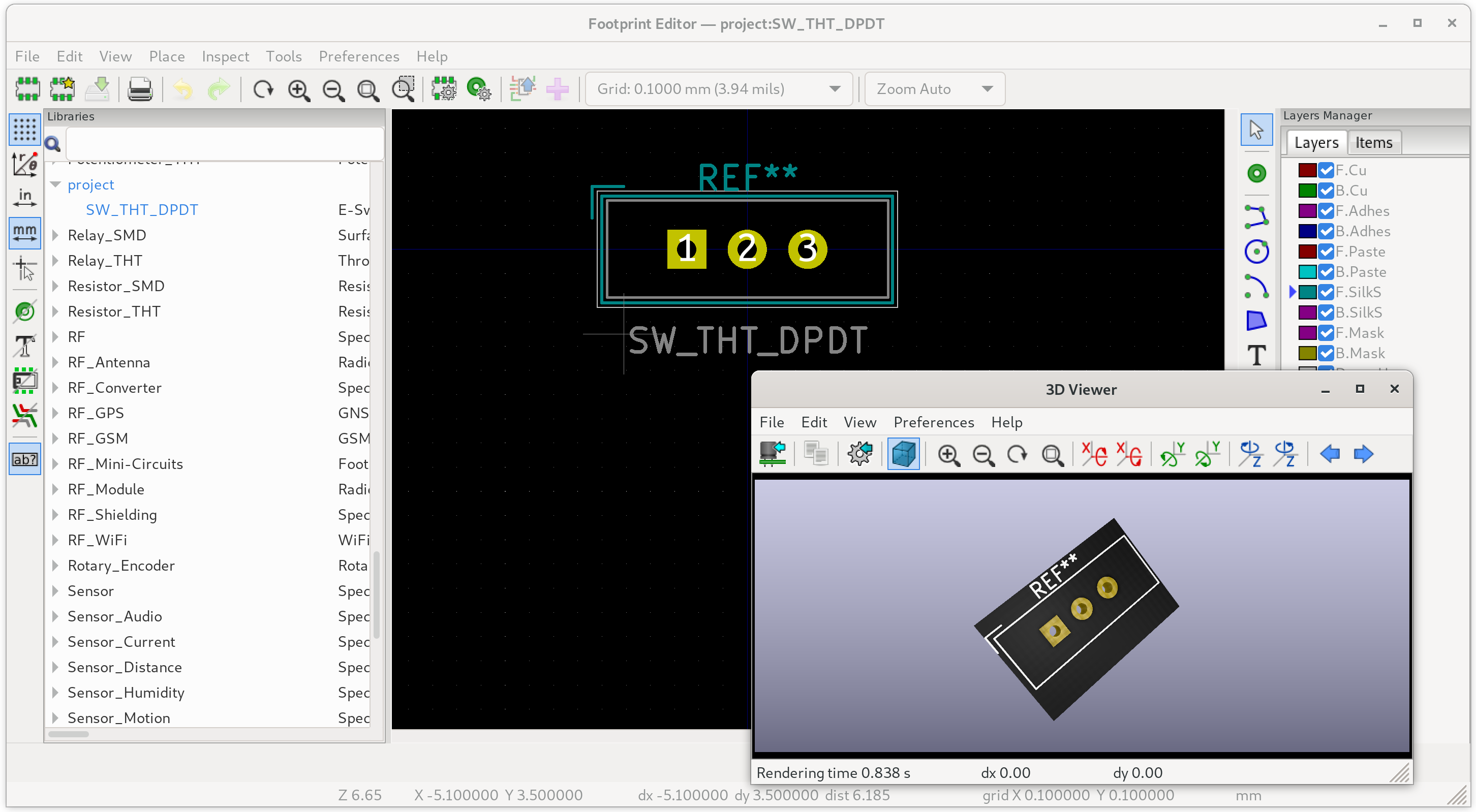 I could not find anything which matched the footprint of the mini SPDT switches that I’m using, so I made my own.