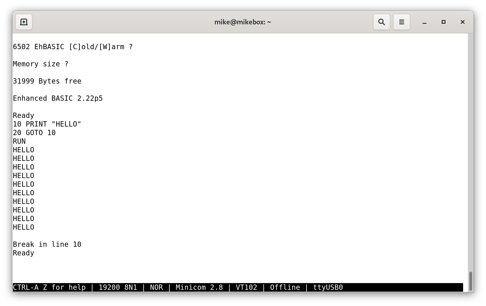 My home-built computer has a switch for selecting between two ROM’s. My plan is to write my own code in assembly language, but keep this port of EhBASIC in the secondary ROM, so that the computer can always boot to something that works.