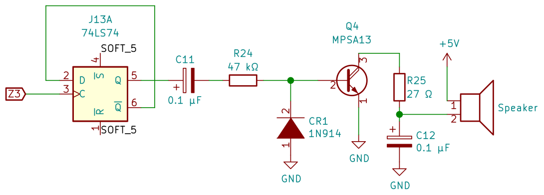 The linked book does a good job of explaining the details, but the important part for this blog post is simply that Z3 is an address decoding output. It is normally high, but is low for half a cycle each time that memory address $C030 is accessed. This is fed to a flip-flop, which will toggle each time this happens, driving a speaker.