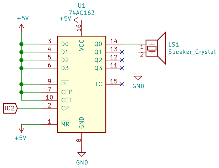 To produce a beep, I wanted a square wave with a 50% duty cycle. The Apple II used a 74LS74 dual D flip flop IC for this, which I don’t have in my inventory. Instead, I used a 74AC163 4-bit counter.