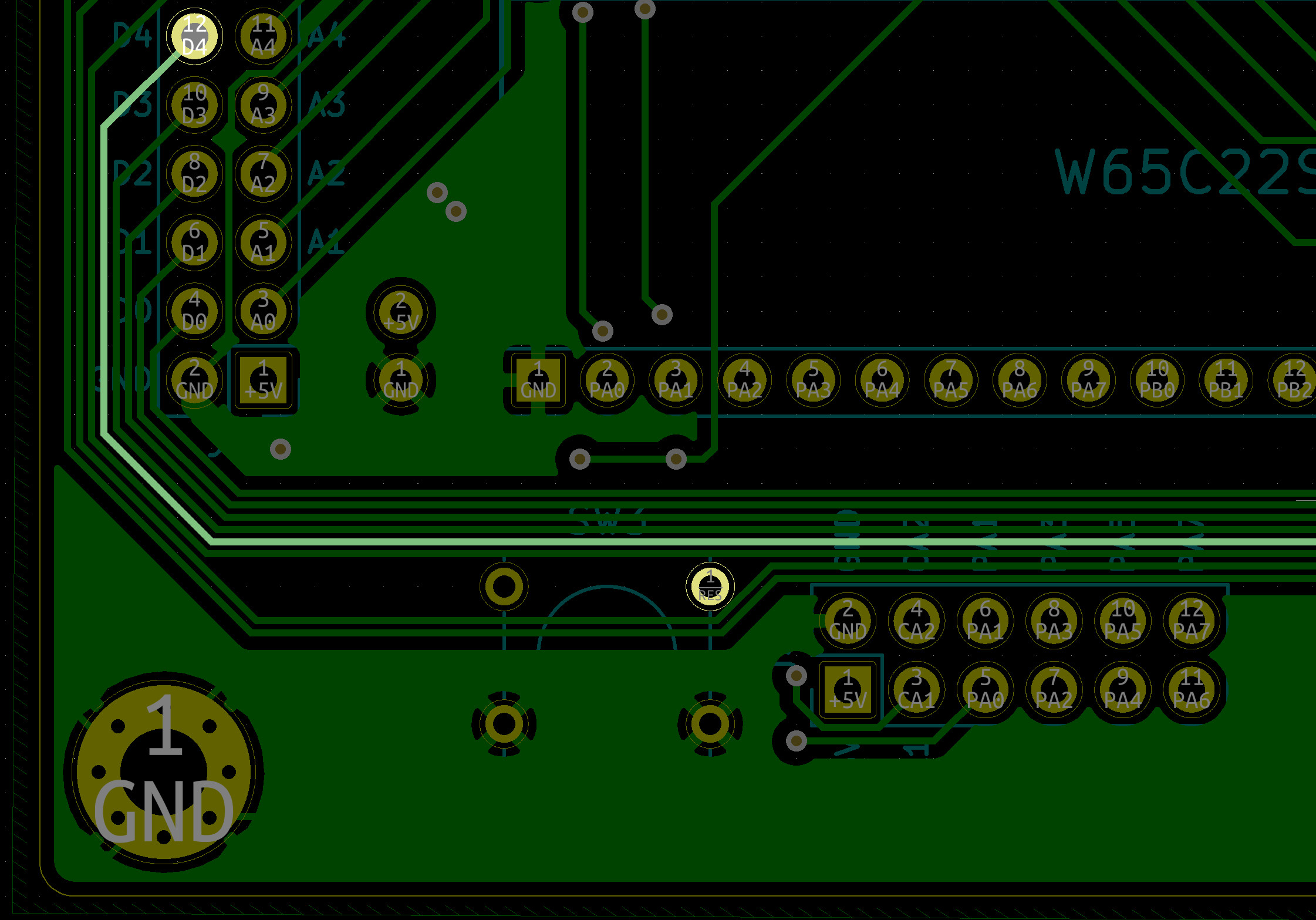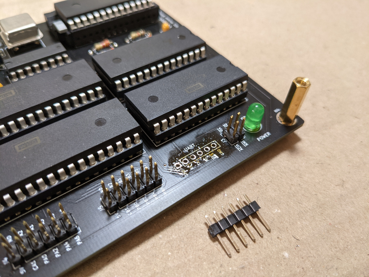 I checked everything with a multimeter before powering it on. The UART pins were connected correctly to the 65C51N chip and ground. No continuity between the board’s power and the external power unless the power button is pressed, no continuity between the reset line and ground unless the reset button is pressed, and so on.