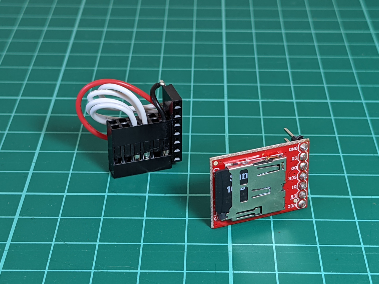 I made a small adapter by attaching a female pin header to a Du Pont housing with superglue. I couldn’t get the “card detect” feature to work, so I wired it up differently to my previous blog post, and updated the code to match. Details of the new wiring is on GitHub.