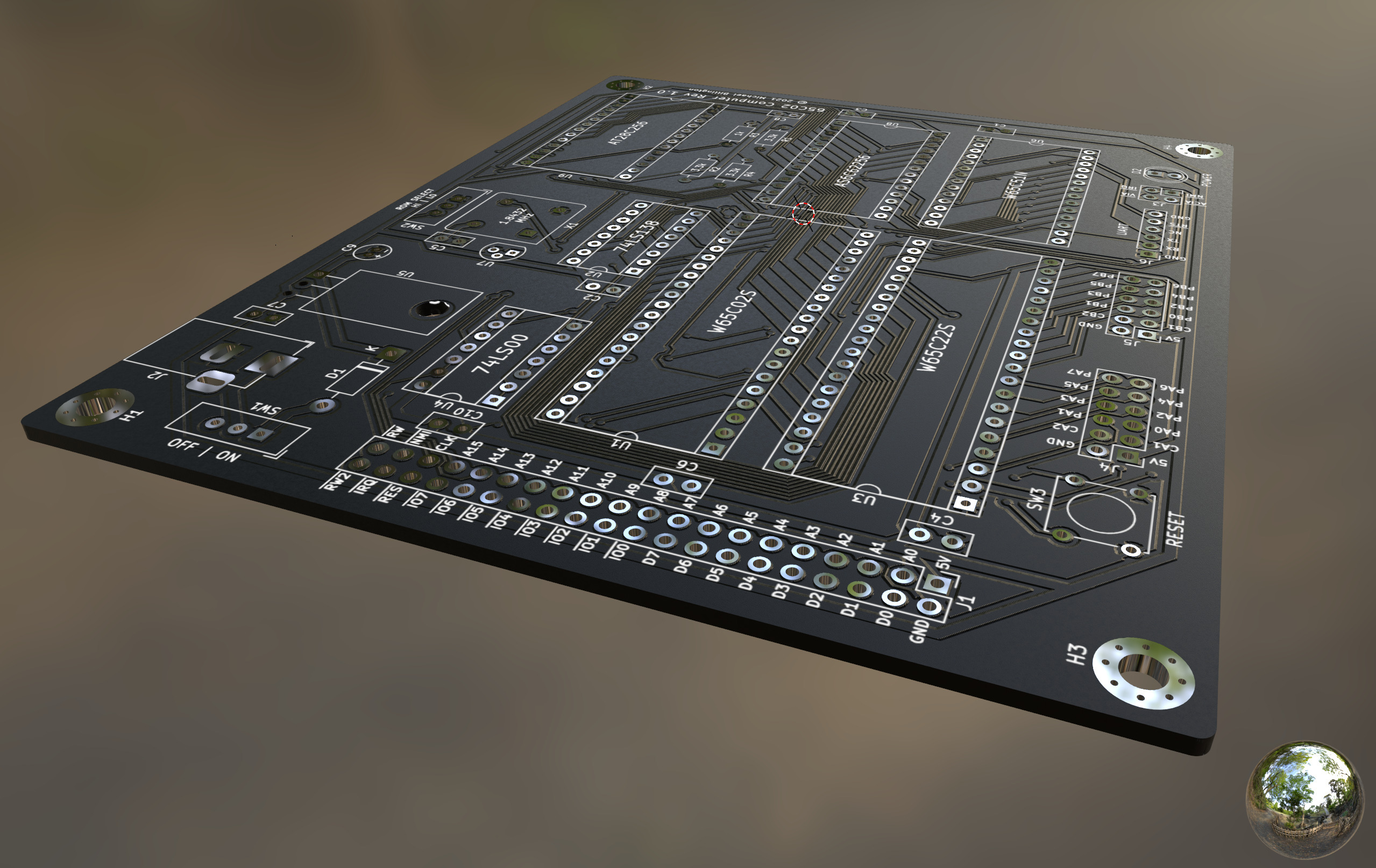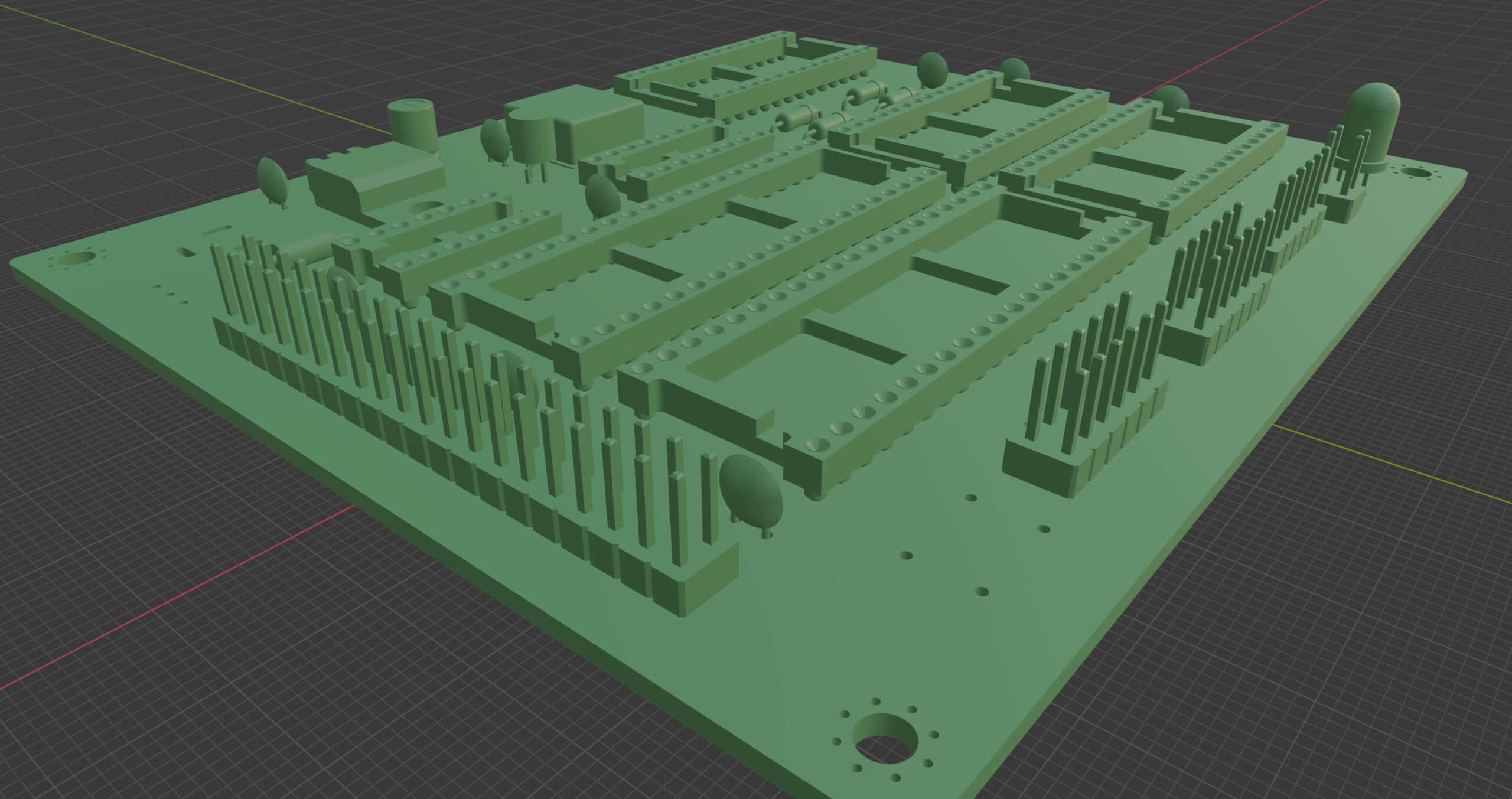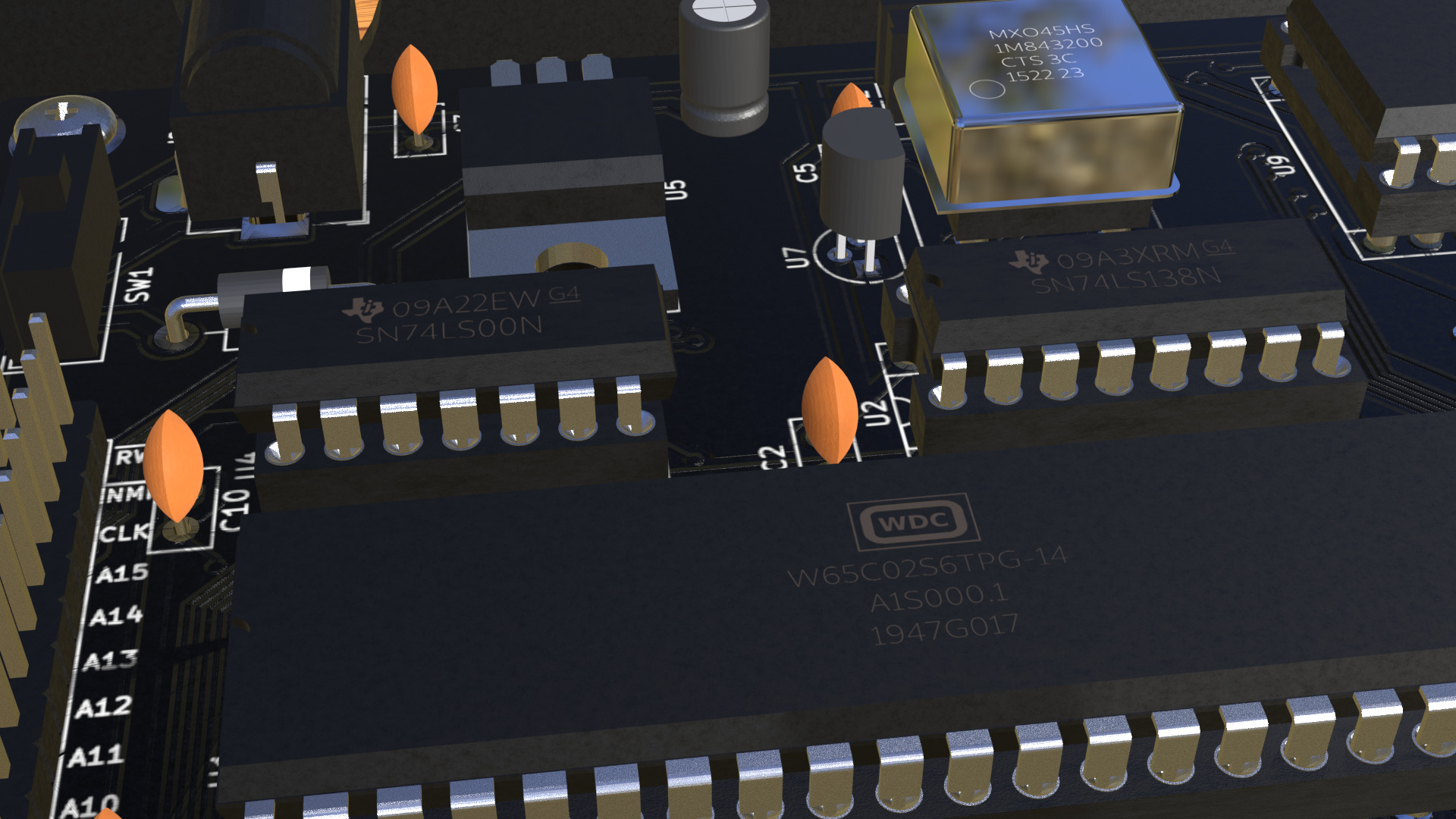 I thought that the PCB in the previous image was too bare. The real PCB uses plated through-holes, and almost every hole in a real PCB has a shiny solder pad around it.