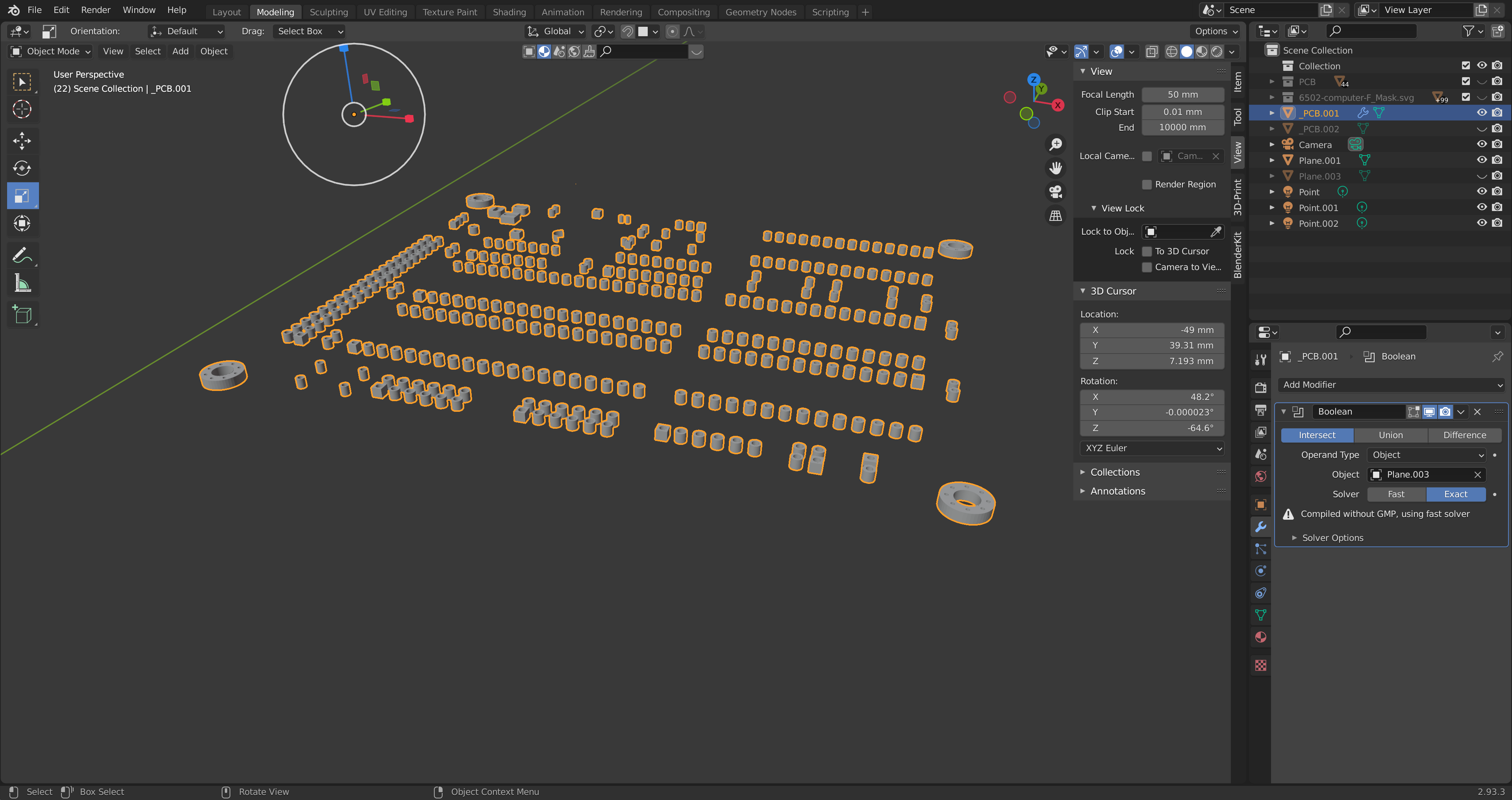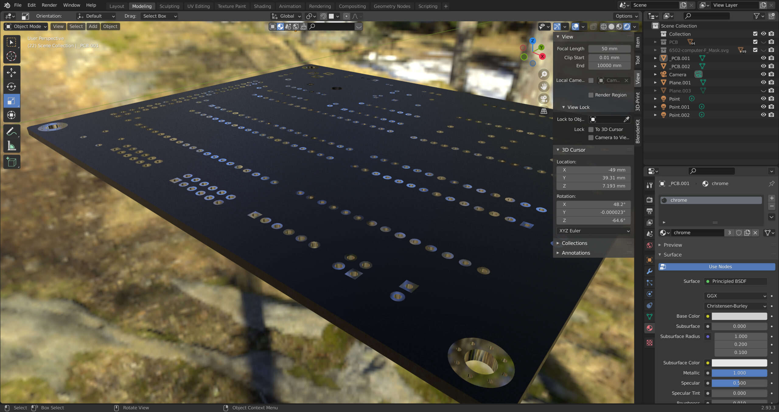 I imported this SVG into Blender, scaled it to fit the PCB, extruded it, then went through a series of boolean modifiers. This resulted in a new object which contained every part of the PCB which was not covered in solder mask. I assigned this a shiny metal material.