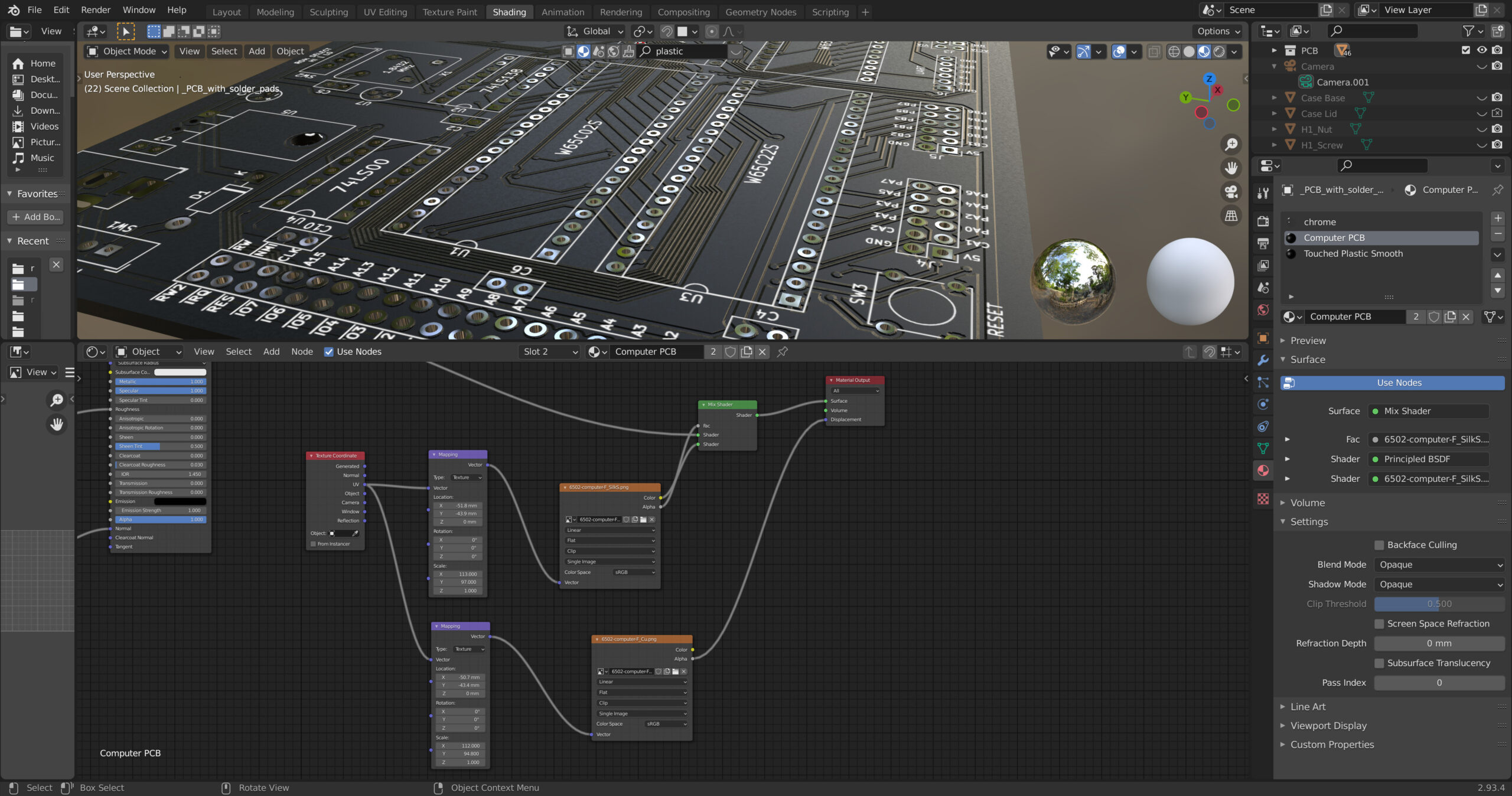 I then used InkScape to change this to white text on a transparent background, before finally exporting it as a PNG. I mixed this into the procedural texture which I was using for the PCB, using the transparency as the mix factor. As a final touch, I also exported the front copper layer, and used this as the displacement input for the final material. The nodes are shown in the screen capture below.