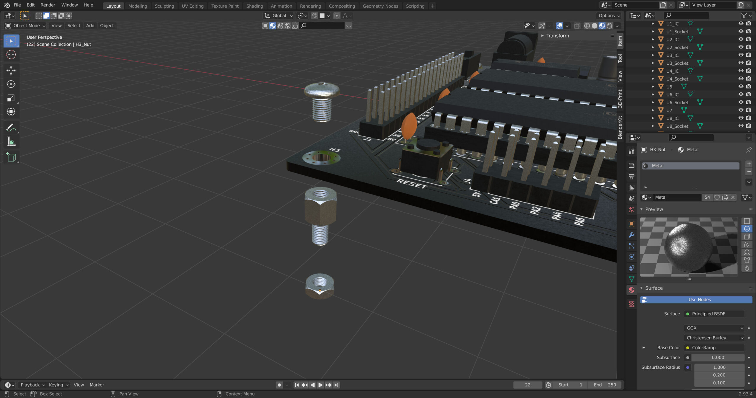 There were plenty more parts which I couldn’t export from KiCad, and needed to model from scratch. I used the bolt factory add-on to create screws, nuts, and hex standoffs (both a screw and a nut, combined).