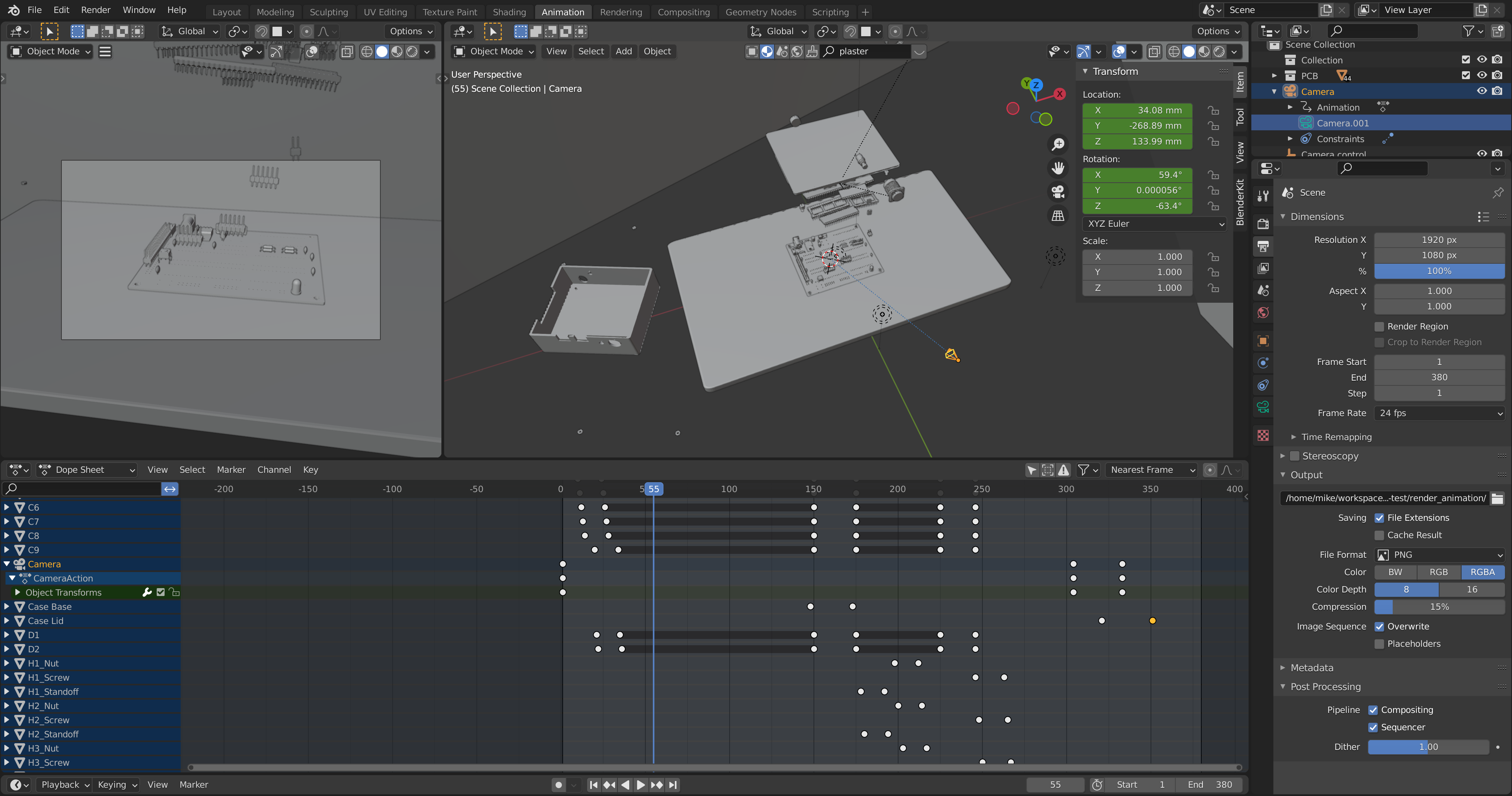 During this build, I needed to wait for some parts, so I had some time to see what I could do with the 3D models of the case and circuit board. I ended up animating the assembly process, and learned a couple of tricks along the way.
