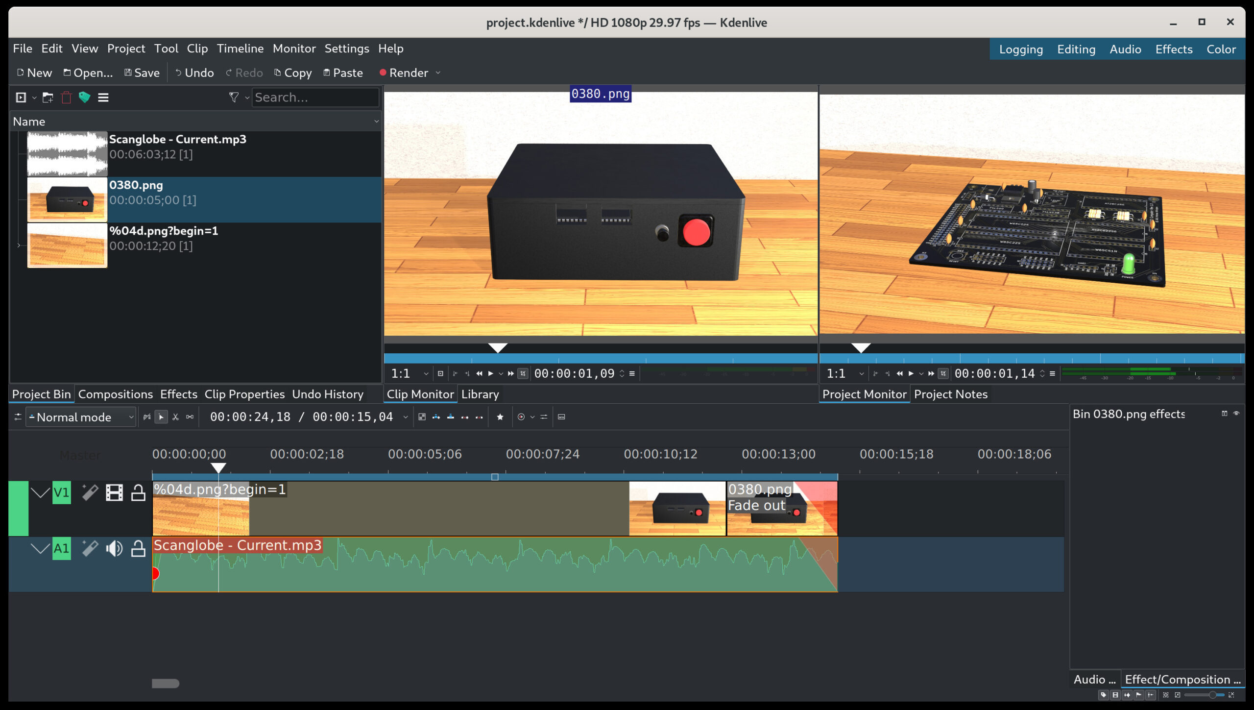 I imported the rendered animation into Kdenlive, which can process image sequences (the button is “Add clip” / “Import as sequence”), fetched a track from the Free Music Archive (Scanglobe - Current. CC BY-NC), and rendered the project.