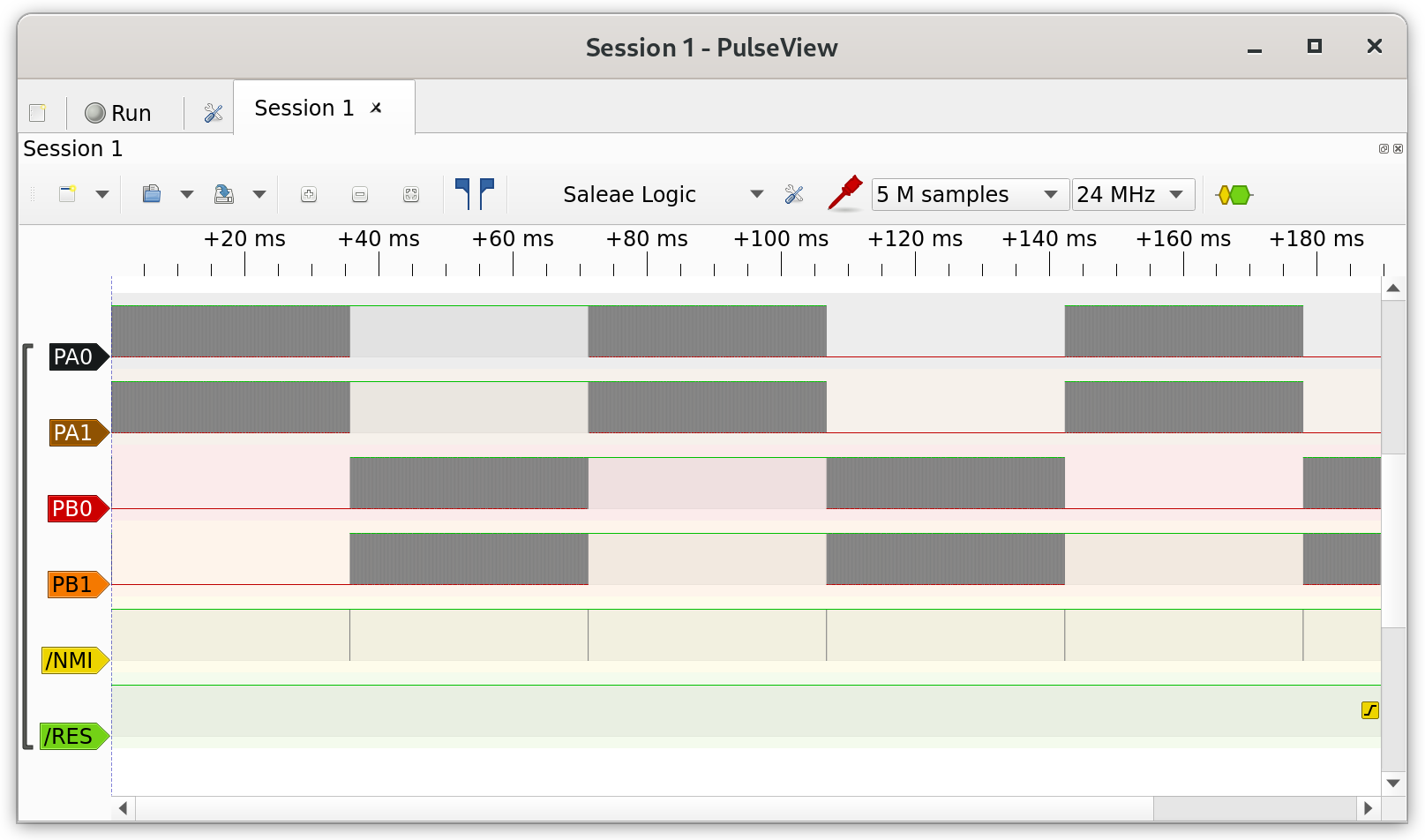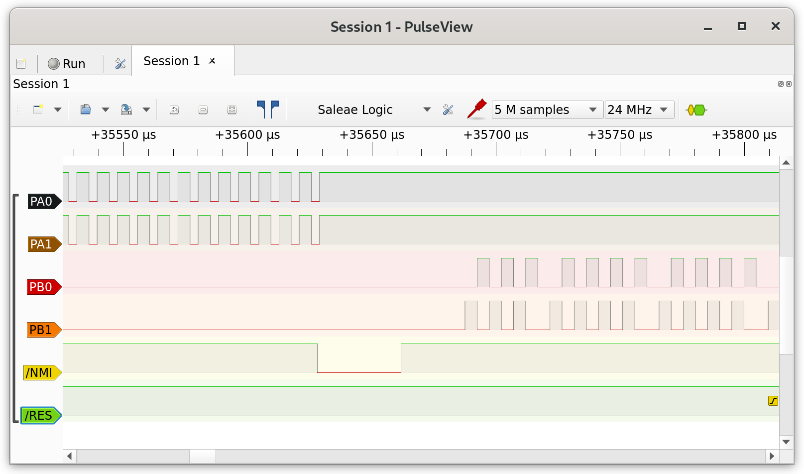 I connected a logic analyser to two wires from each output port, the NMI interrupt line, and the reset signal, and opened up sigrok.