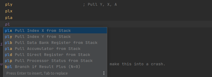 As result, I shipped some improvements to my 6502 assembly plugin for JetBrains IDE’s, which I have blogged about previously. The plugin will now provide suggestions for mnemonics. There is a project setting for 6502 vs 65C02 vs 65C816 mode, and it will only suggest mnemonics which are available for the CPU.