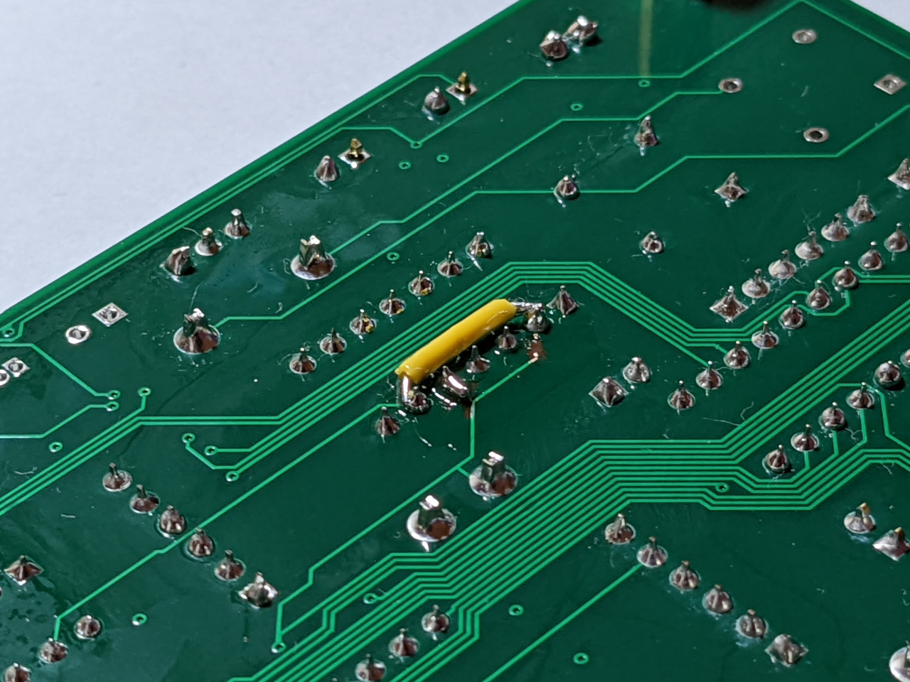The first problem I found was with the reset button - I had switched to using a footprint with the correct pin spacing, but had assigned the pins incorrectly, so I needed to cut/bend some legs and install it rotated 90 degrees.
