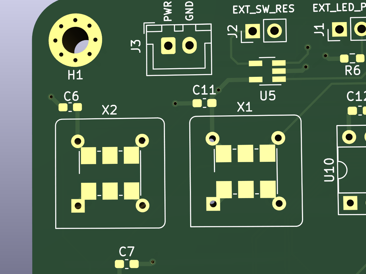 The oscillator I’m using on the breadboard prototype is a DIP-8 package. A larger variety of oscillators are available as a 5x7mm QFN package, where the four corner pins have the same function as the DIP-8 version. I added an alternative footprint, which fits without taking up any extra board space. I expect that I’ll only use this if I attempt to run the board at 3.3V later.