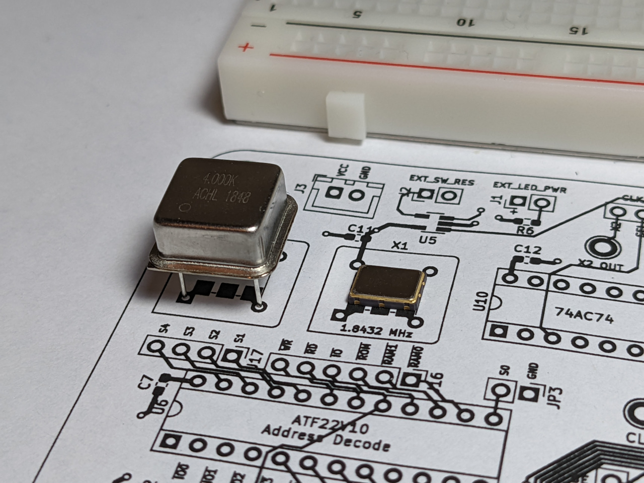 This does halve the CPU clock speed, so I added jumpers to allow an alternative clock source to be selected for the CPU, where previously the UART and CPU clocks needed to be the same. Note that there is an error in the wiring here, which I only discovered later.