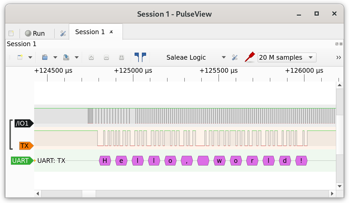 However, I was able to run more or less the same test program I used before, and it now works reliably. This is captured through a Cypress FX2-based logic analyser using Sigrok.