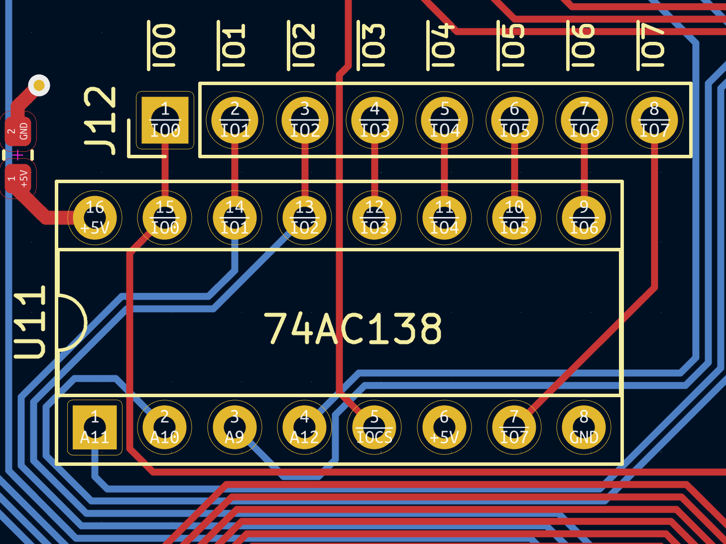 I also avoided creating one large expansion header, and instead exposed signals in places which are easy to route. For example, the I/O device select signals are exposed on a pin header right beside the chip which generates them.
