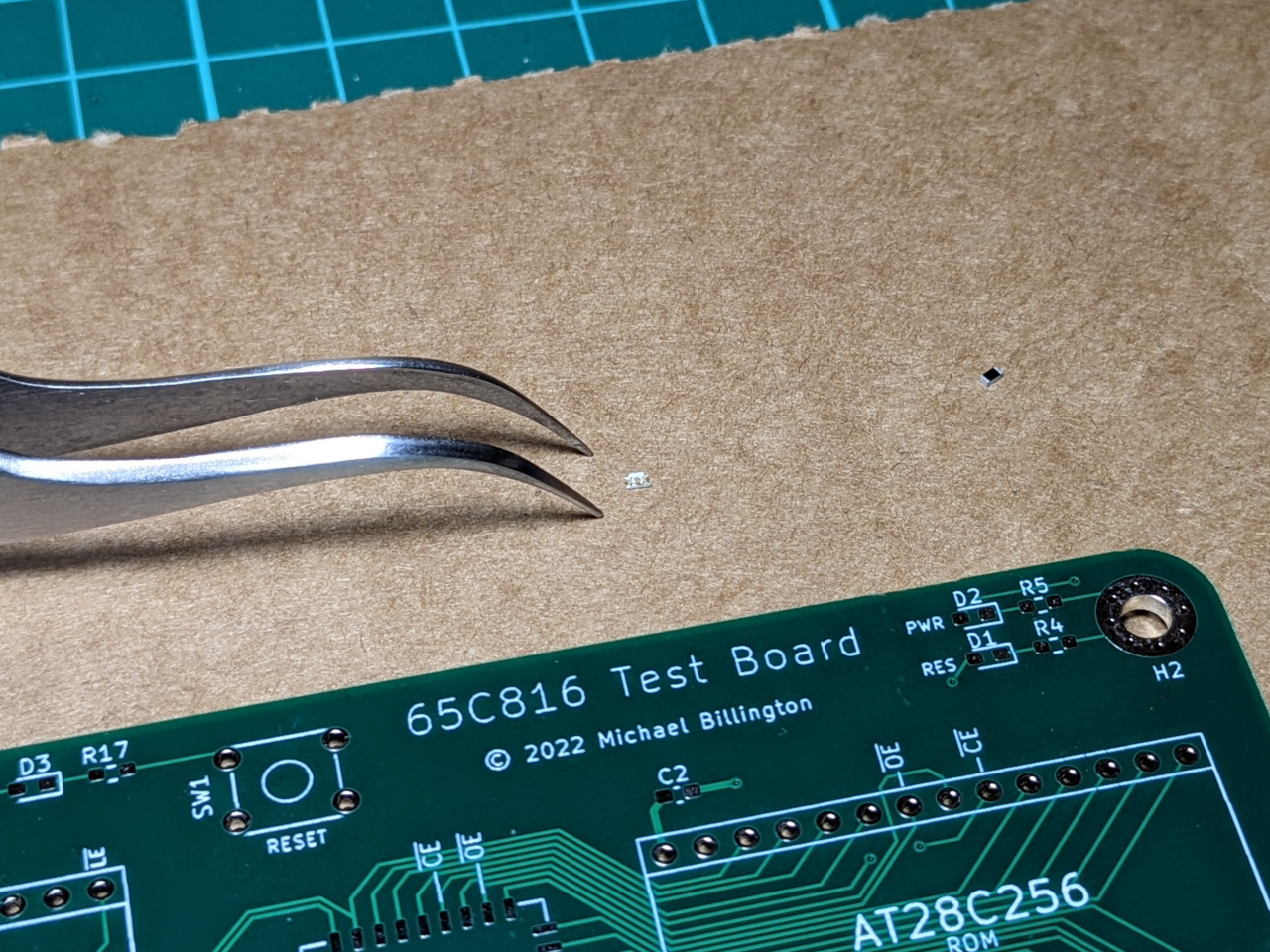 I assembled the board incrementally, starting with the power LED. Most of the passive components on this board are 0603 (imperial) size surface-mount parts, and I’ve used footprints with long pads for hand soldering.