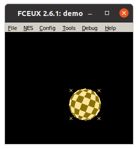 If you are familiar with NES development, then you will probably notice that there is nothing ground-breaking going on here. The ball is made up of 64 8x8 sprites, bouncing around the screen over a static background.