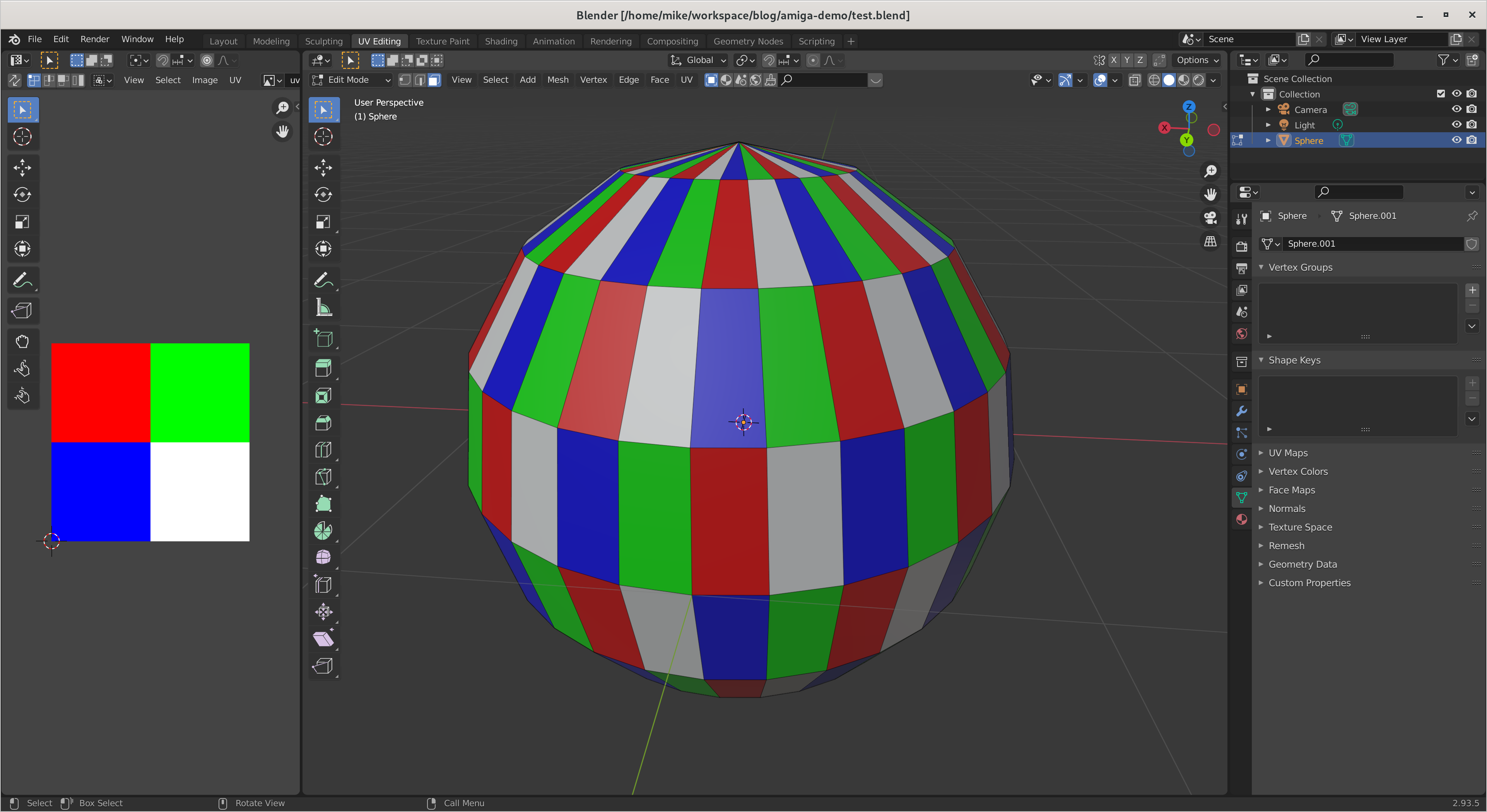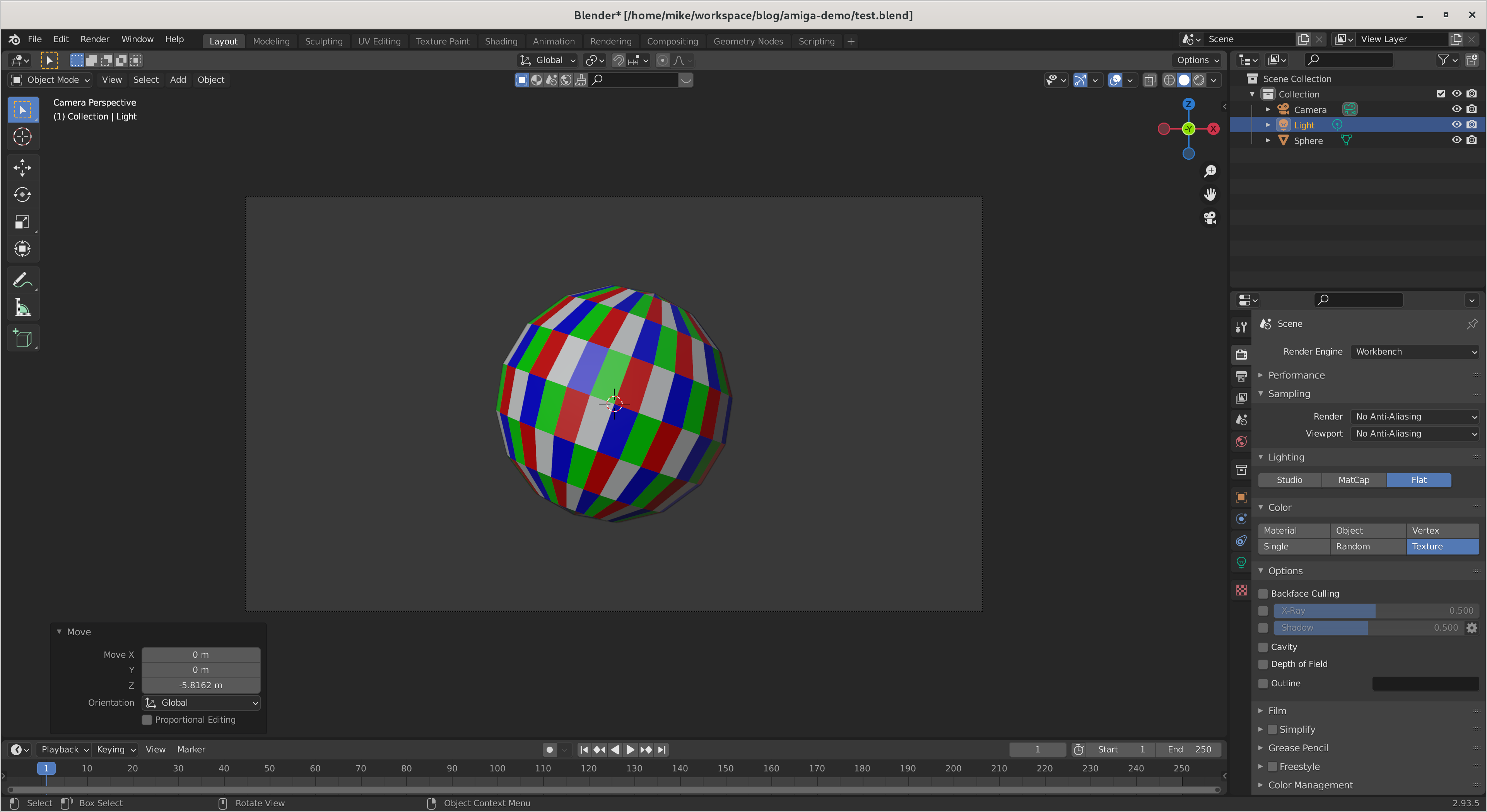 For the X position, I use a fixed speed, and simple collision detection with left/right boundaries. The animation frame is calculated from the X position, so the ball changes rotation depending on which direction it is moving, just like the Amiga demo.