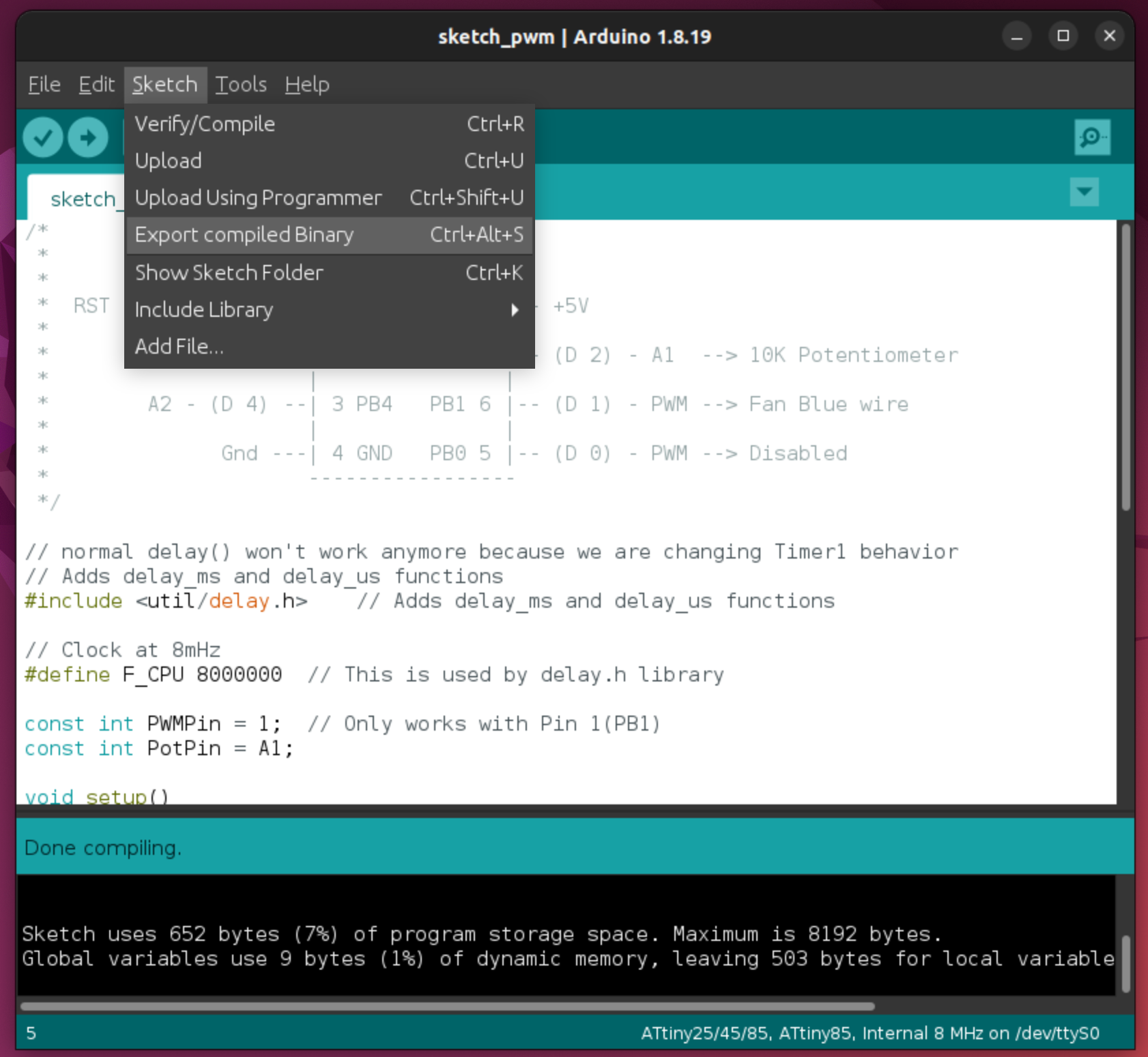After a few false starts trying to compile manually, I followed this guide to get the ATtiny85 ‘board’ definition loaded into the Arduino IDE.