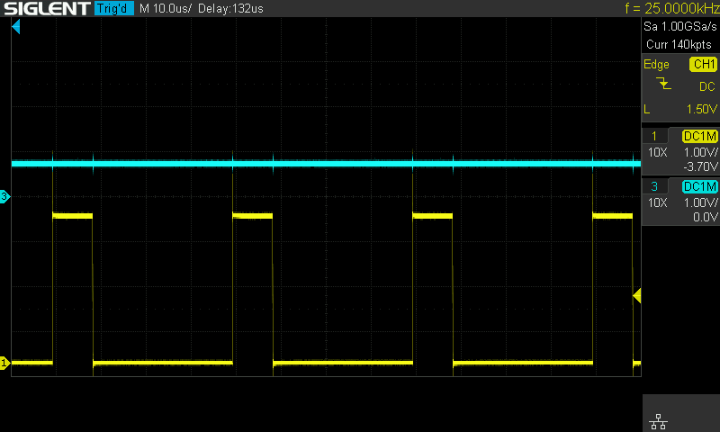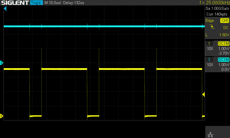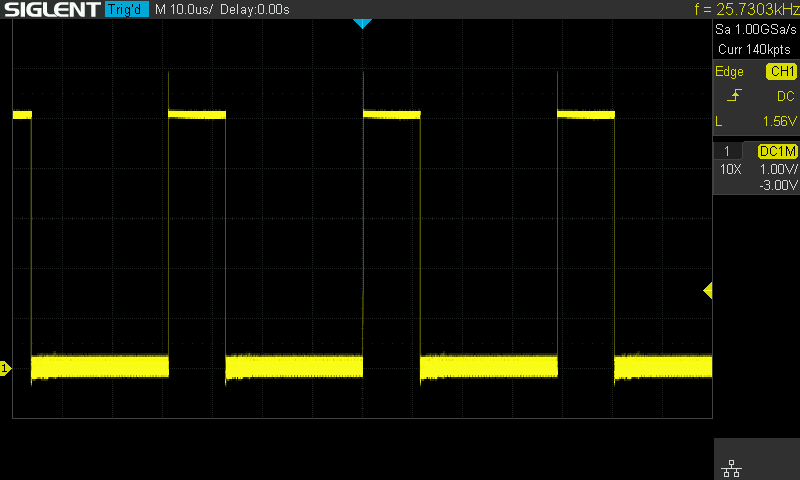 Checking the output again, the signal was the correct amplitude this time, but the frequency does move around a bit. This is likely because I’m using the internal RC timing on the chip, which is not very accurate. My understanding is that anything near 25 KHz will work fine.