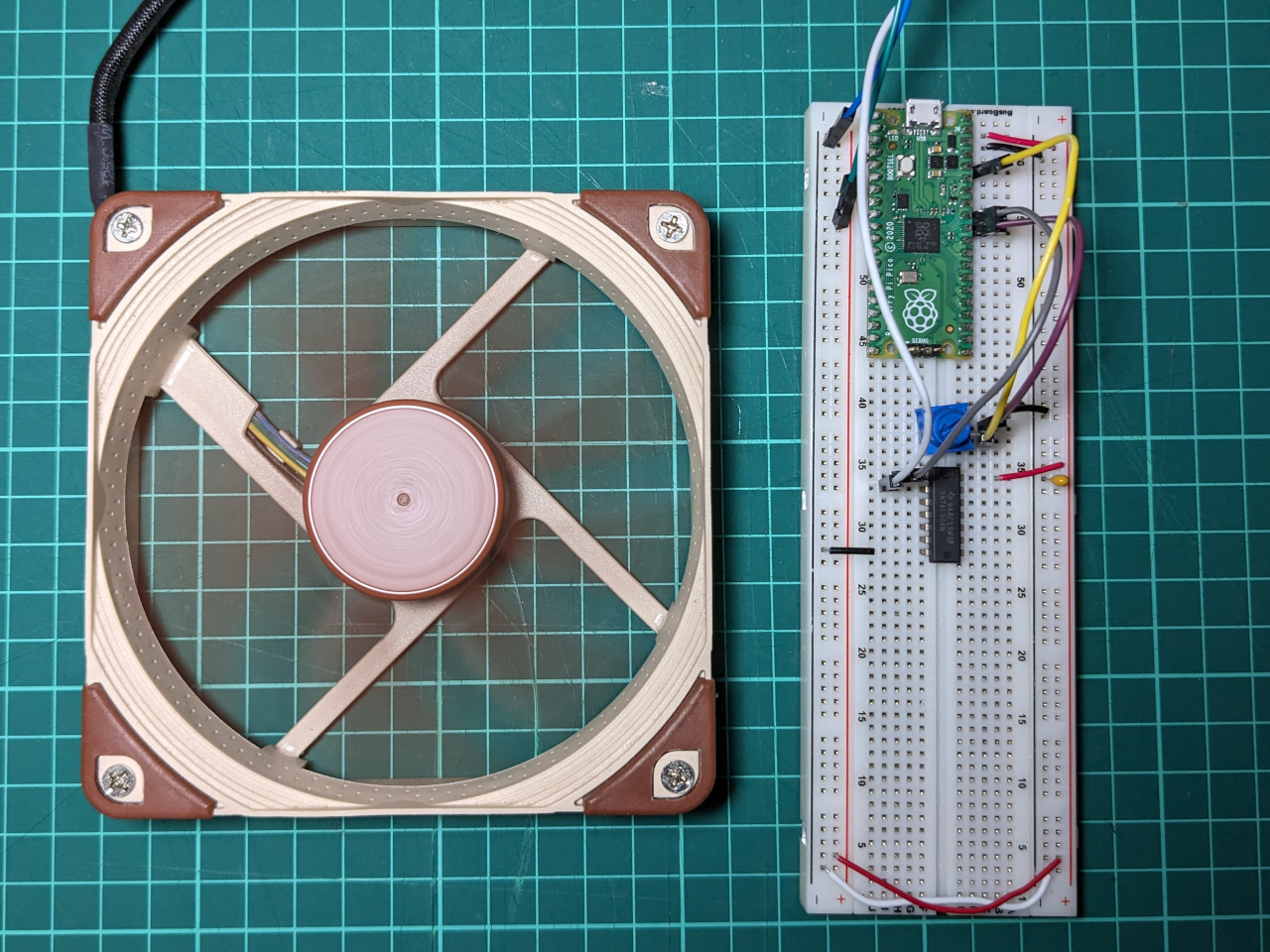 I made only one change to Marcelo’s code, which is to spin the fan at 50% for a few seconds before using the potentiometer-set value. This is to avoid any issues where the fans fail to start because I’ve set them to run at a very low PWM value.