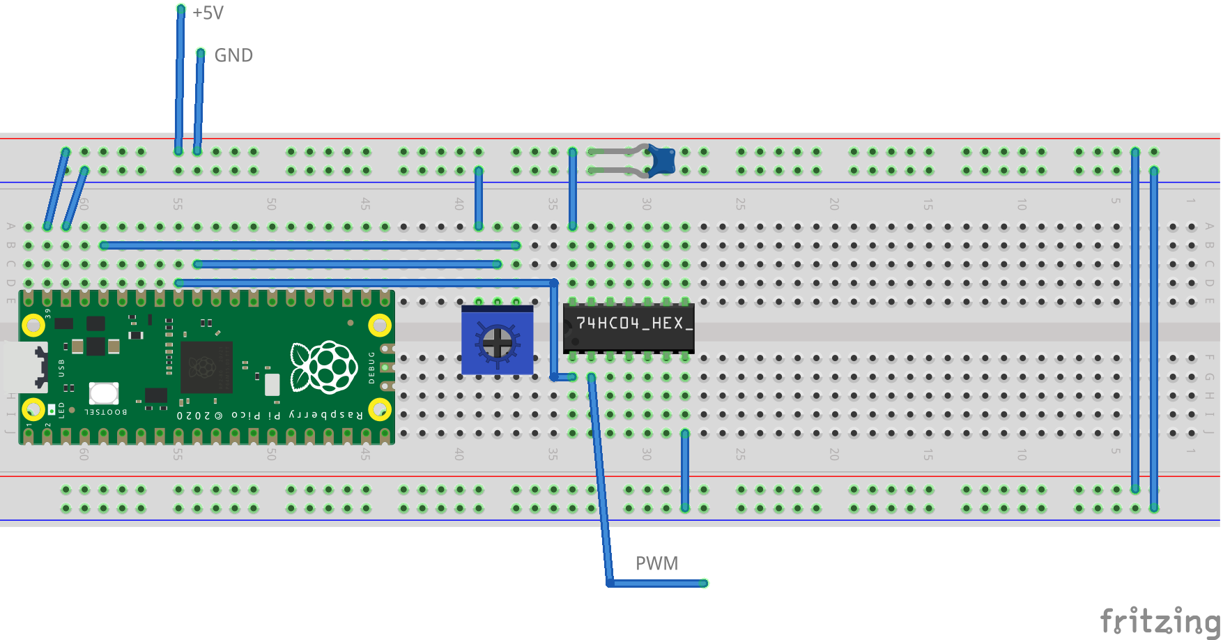 I also captured the breadboard wiring in Fritzing for this blog post. The diagrams are clearer than a photo of a breadboard, but I’m not confident that they communicate information about the circuit as well as alternative approaches. For future posts, I’ll return to using KiCad EDA for schematic capture, unless there is some reason to highlight the physical layout of a breadboard prototype.