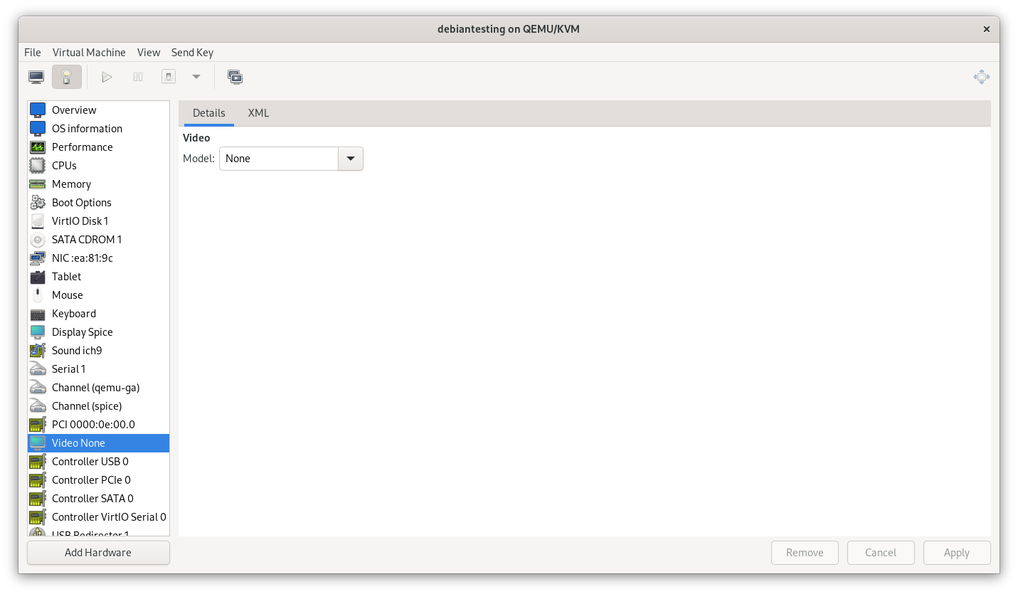 To encourage the VM to output to the physical graphics card, I switched the virtualised video card model from “virtio” to “None”.