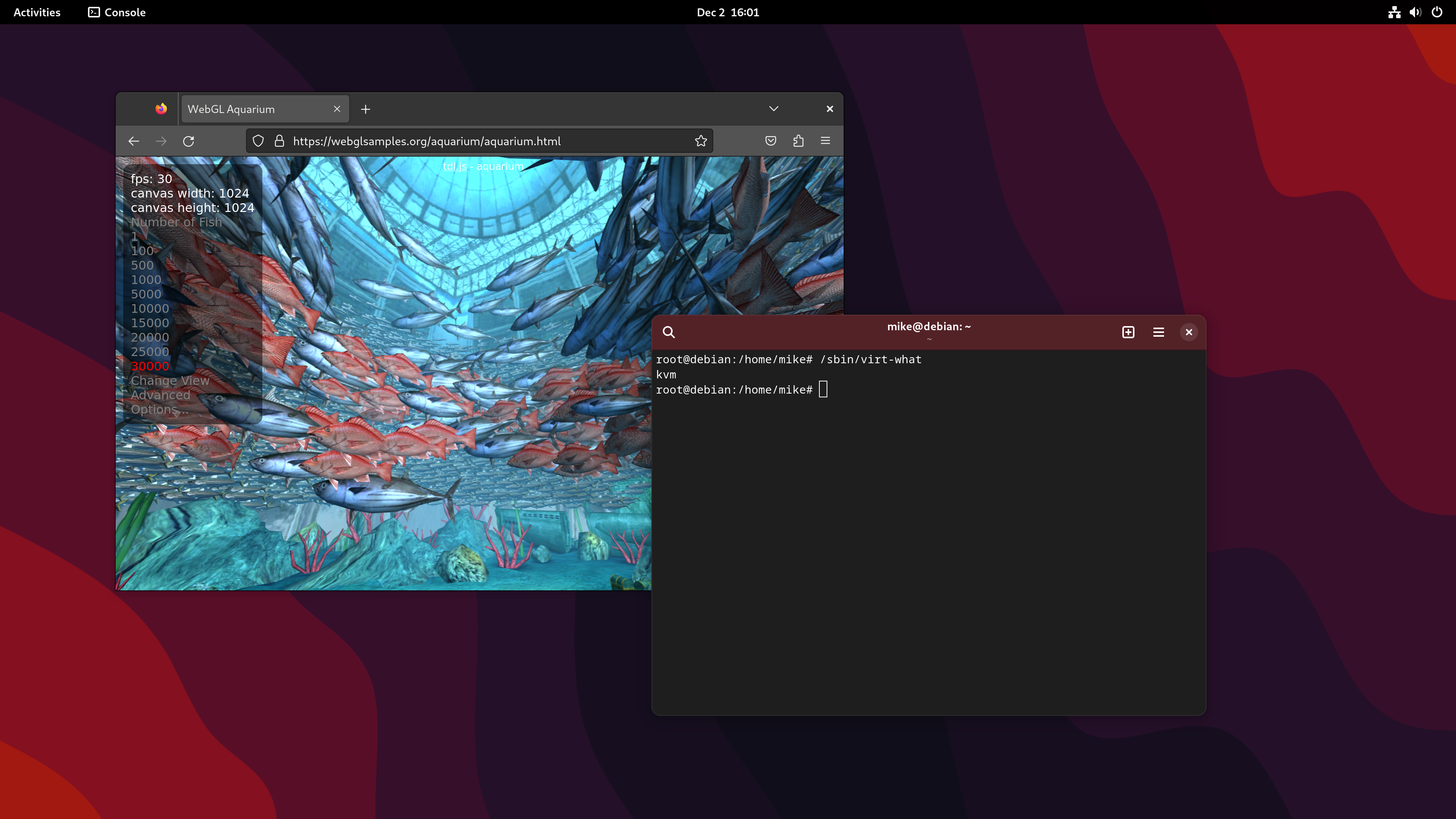 I then switched monitor inputs to the VM, now equipped with a graphics card, and the WebGL aquarium test ran at 30 FPS.