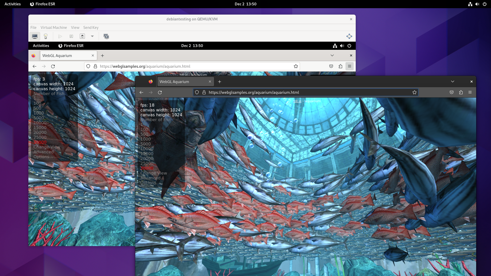 I use the WebGL Aquarium as a simple test for whether 3D acceleration is working. It runs much faster on the host system (this is using the RX 6400). The copy in the VM runs at just 3 frames per second, using SPICE display and virtio virtual GPU at this stage.