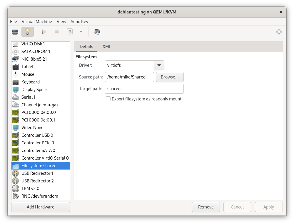 /home/mike/Shared, and start to back up anything that lands there. - I’ll use virtiofs instead of virtio-9p. This claims to be more performant, and it’s apparently possible to get this working on Windows as well.
