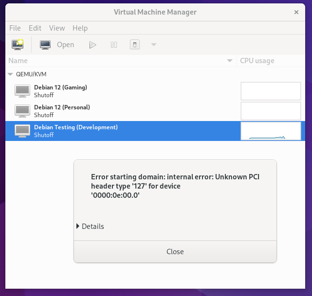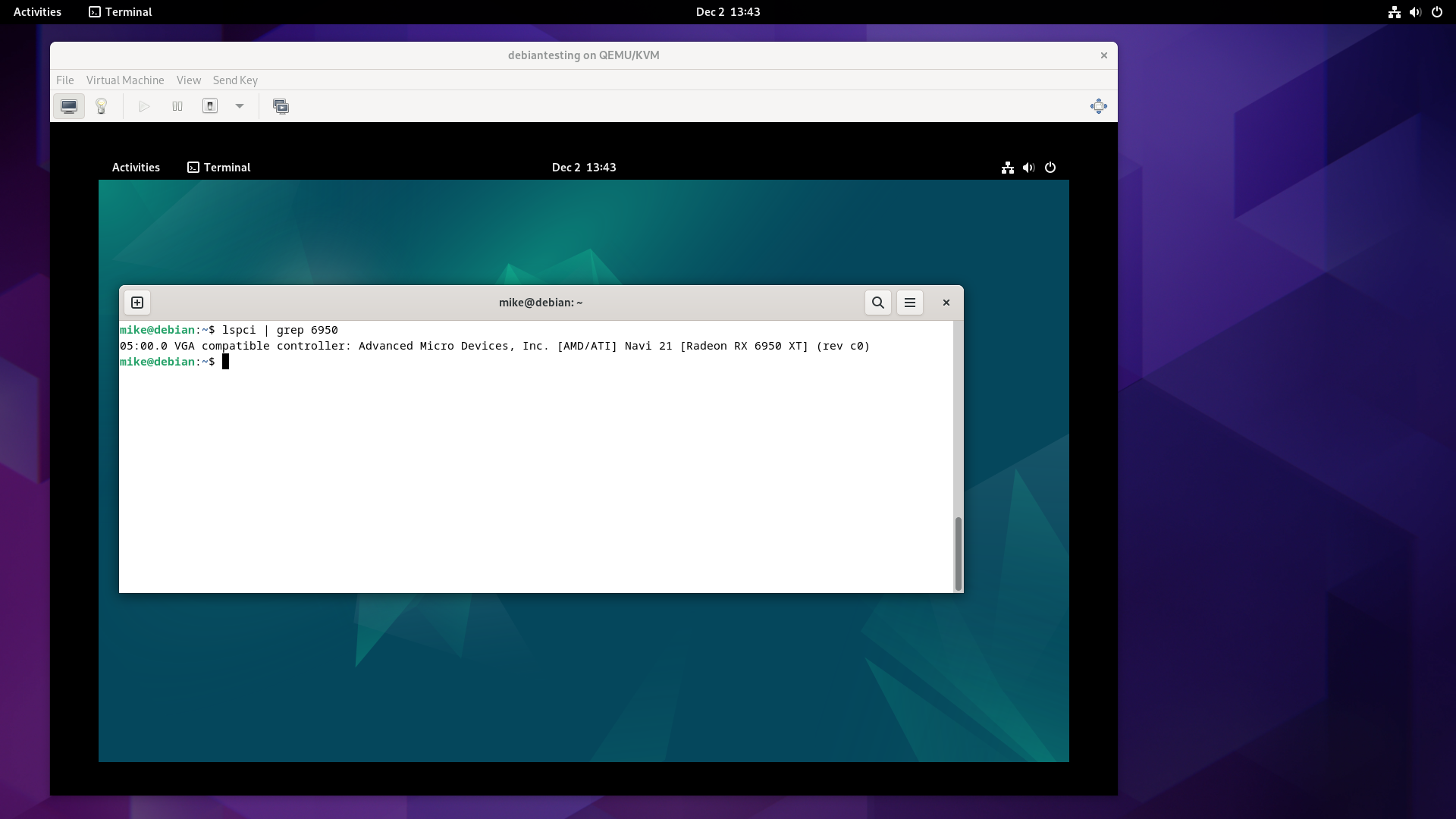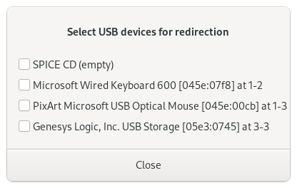 As before, I ran update-grub2, rebooted, added the device to the VM through virt-manager, booted up the VM, and tried to use the device.