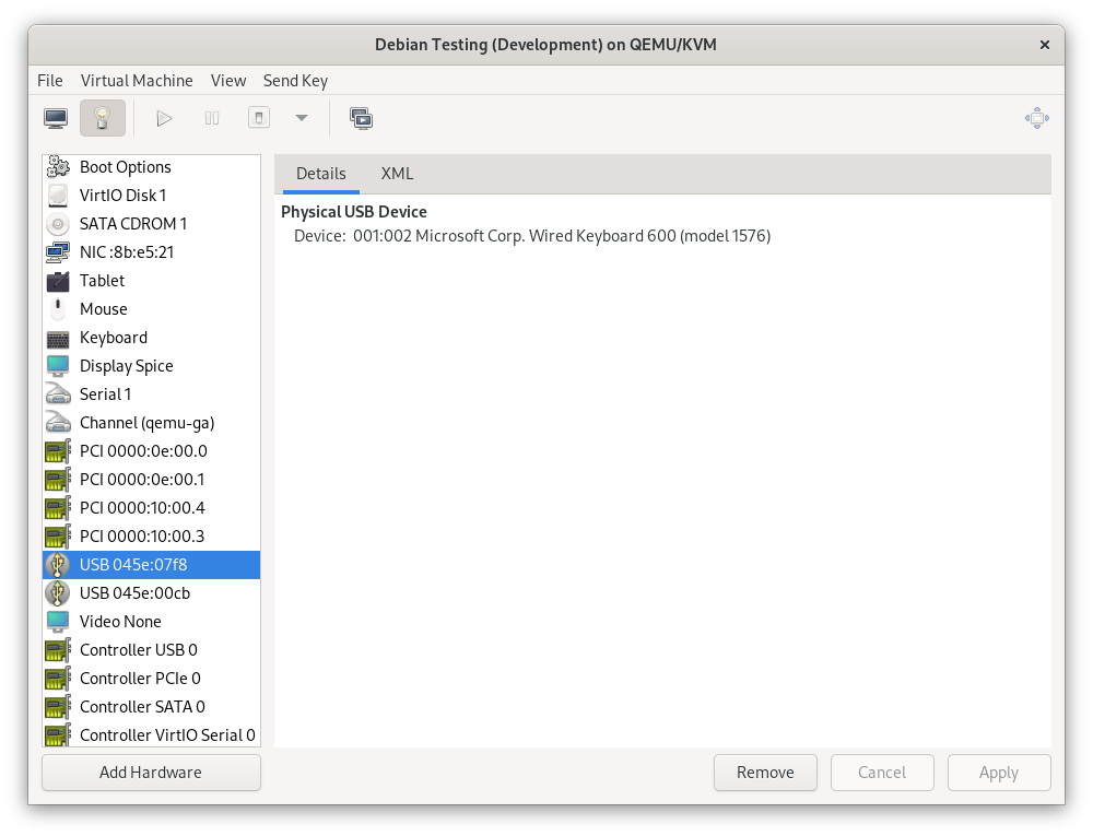 I’ll also continue to use USB passthrough via libvirt to get the keyboard and mouse into the VM. Instead of manually passing these through each time I start the VM, I added each device in the configuration as a “Physical USB Device”.